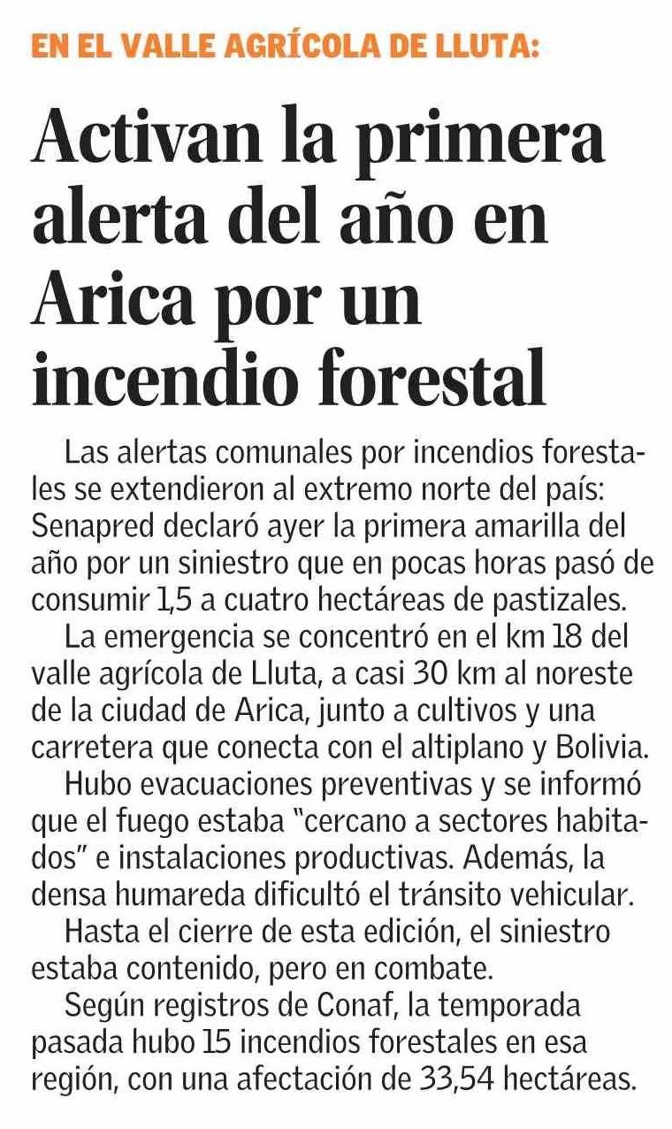 Activan la primera alerta del año en Arica por un incendio forestal 05-02-2026 El Mercurio |