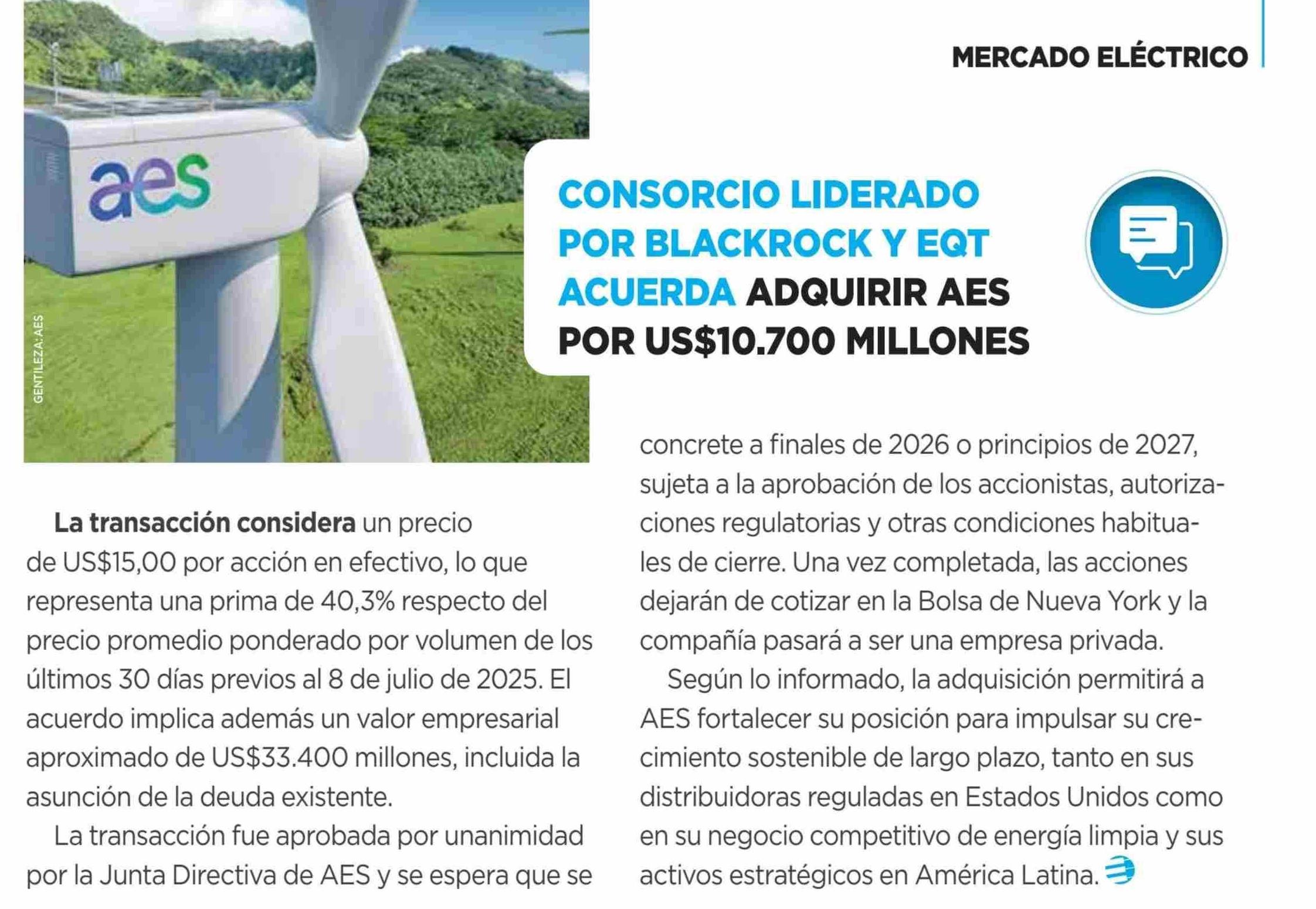 Título: CONSORCIO LIDERADO POR BLACKROCK Y EQT ACUERDA ADQUIRIR AES POR US$10.700 MILLONES