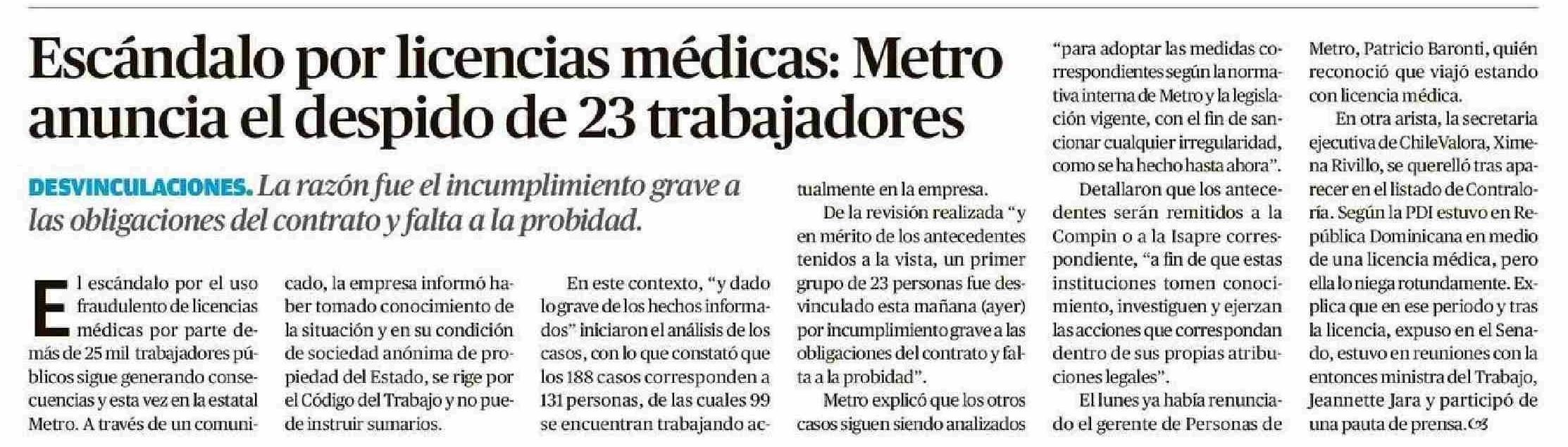 | Título: | Escándalo por licencias médicas: Metro anuncia el despido de 23 trabajadores |