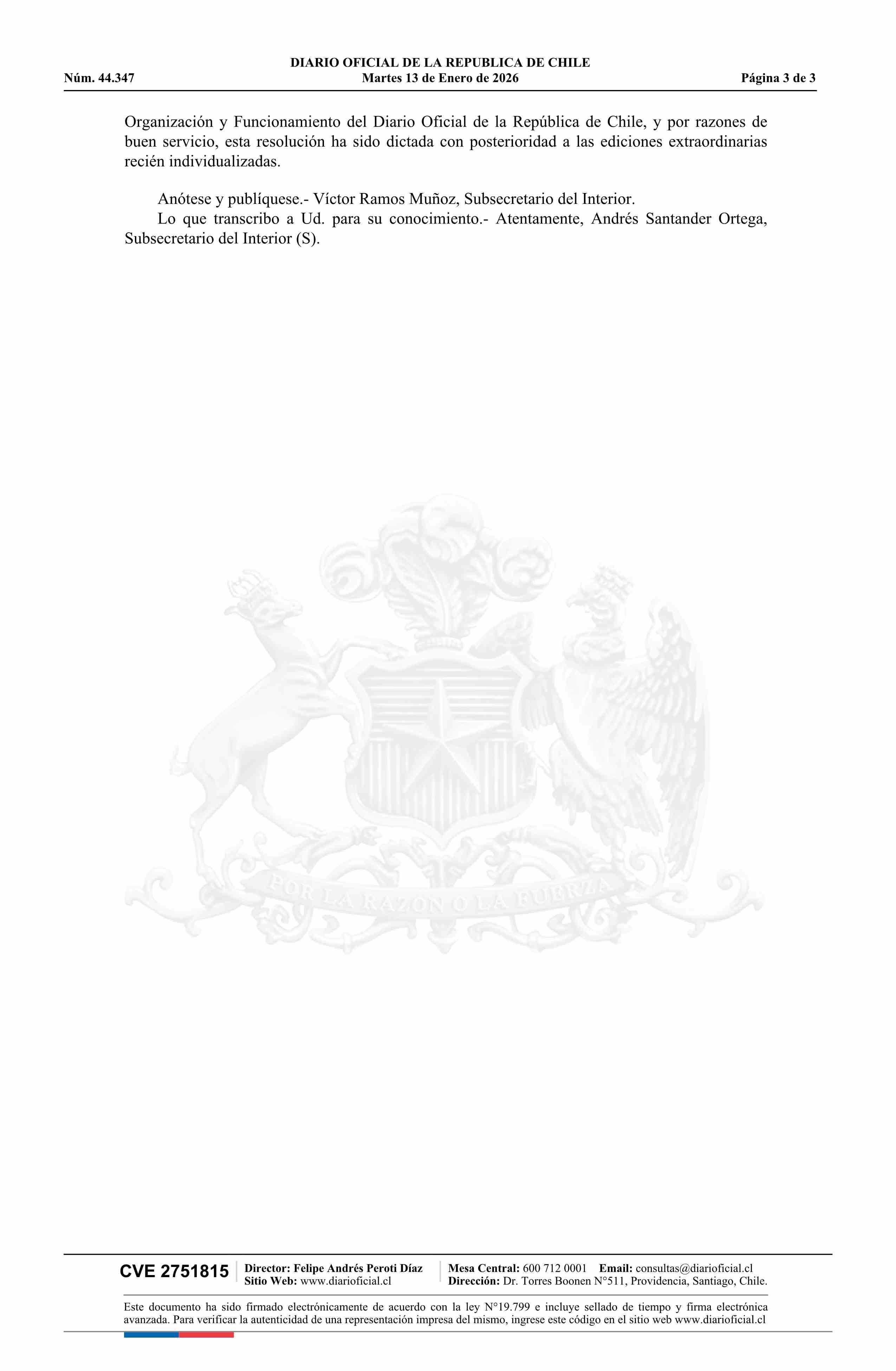 Resolución exenta número 7.083, de 2025.- Autoriza ediciones extraordinarias del Diario Oficial para los días que indica 13-01-2026 DIARIO OFICIAL CHILE - BOLETÍN OFICIAL DE MINERÍA |