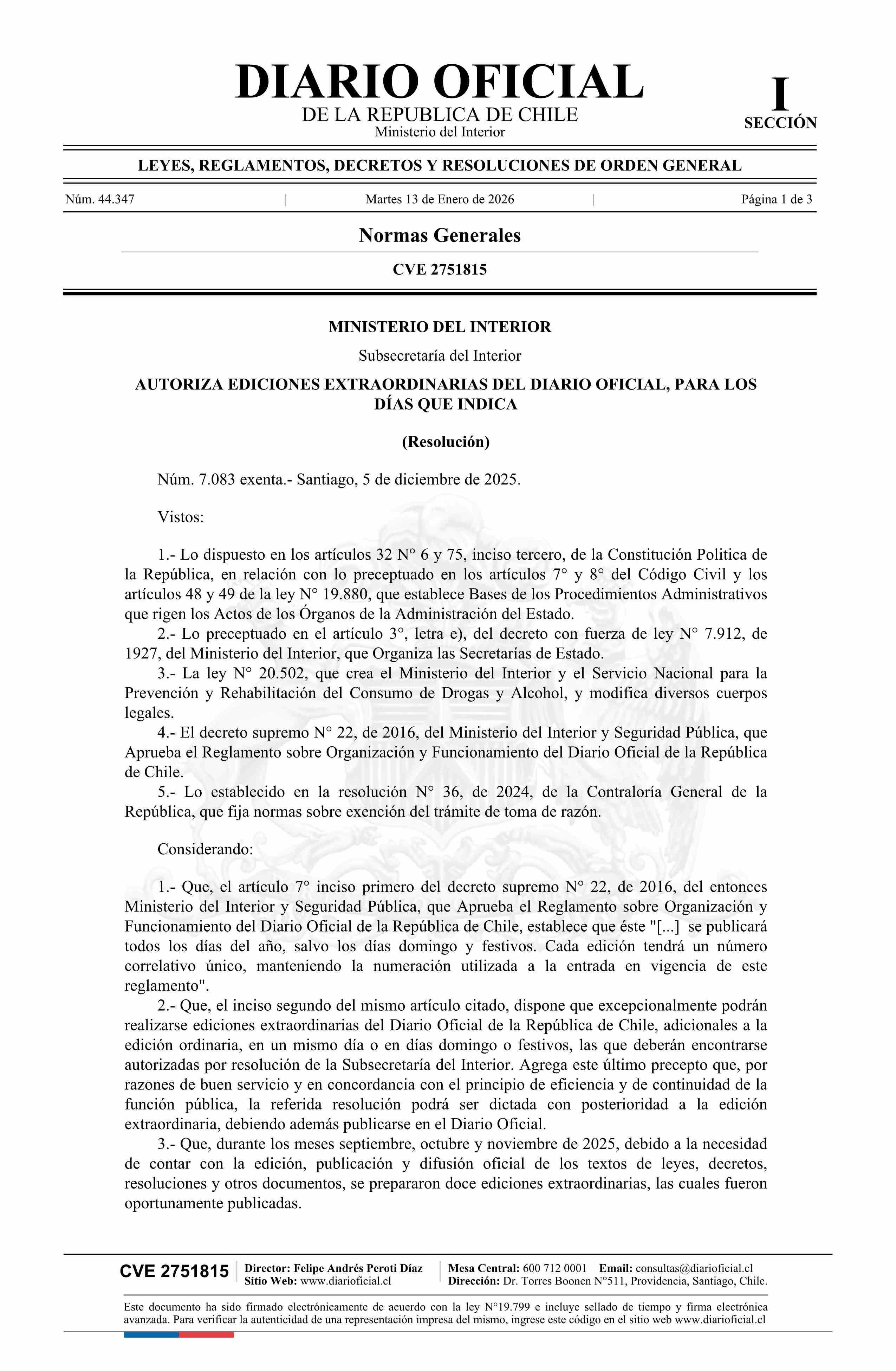 | Título: | Resolución exenta número 7.083, de 2025.- Autoriza ediciones extraordinarias del Diario Oficial para los días que indica |