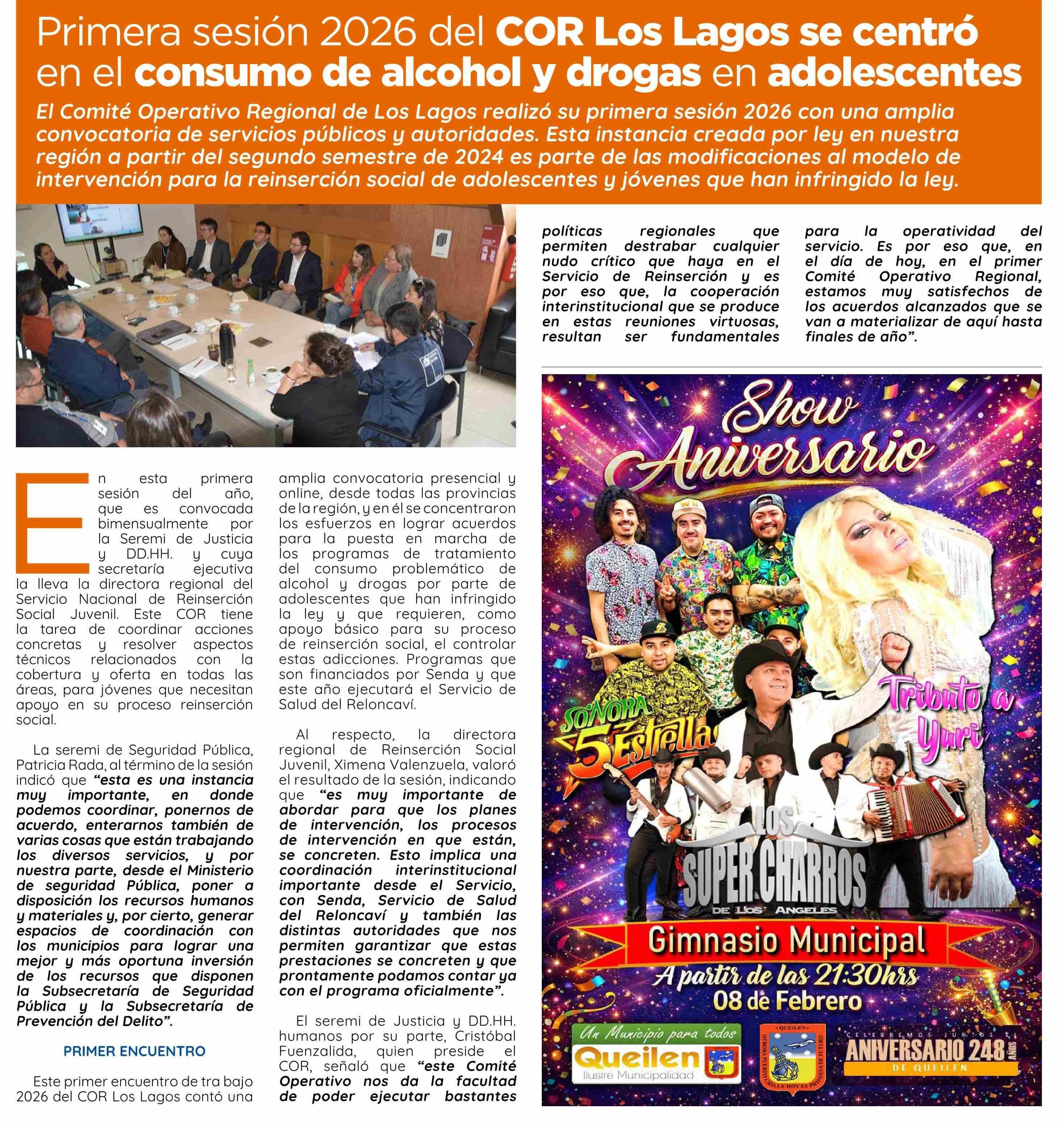Título: Primera sesión 2026 del COR Los Lagos se centró en el consumo de alcohol y drogas en adolescentes