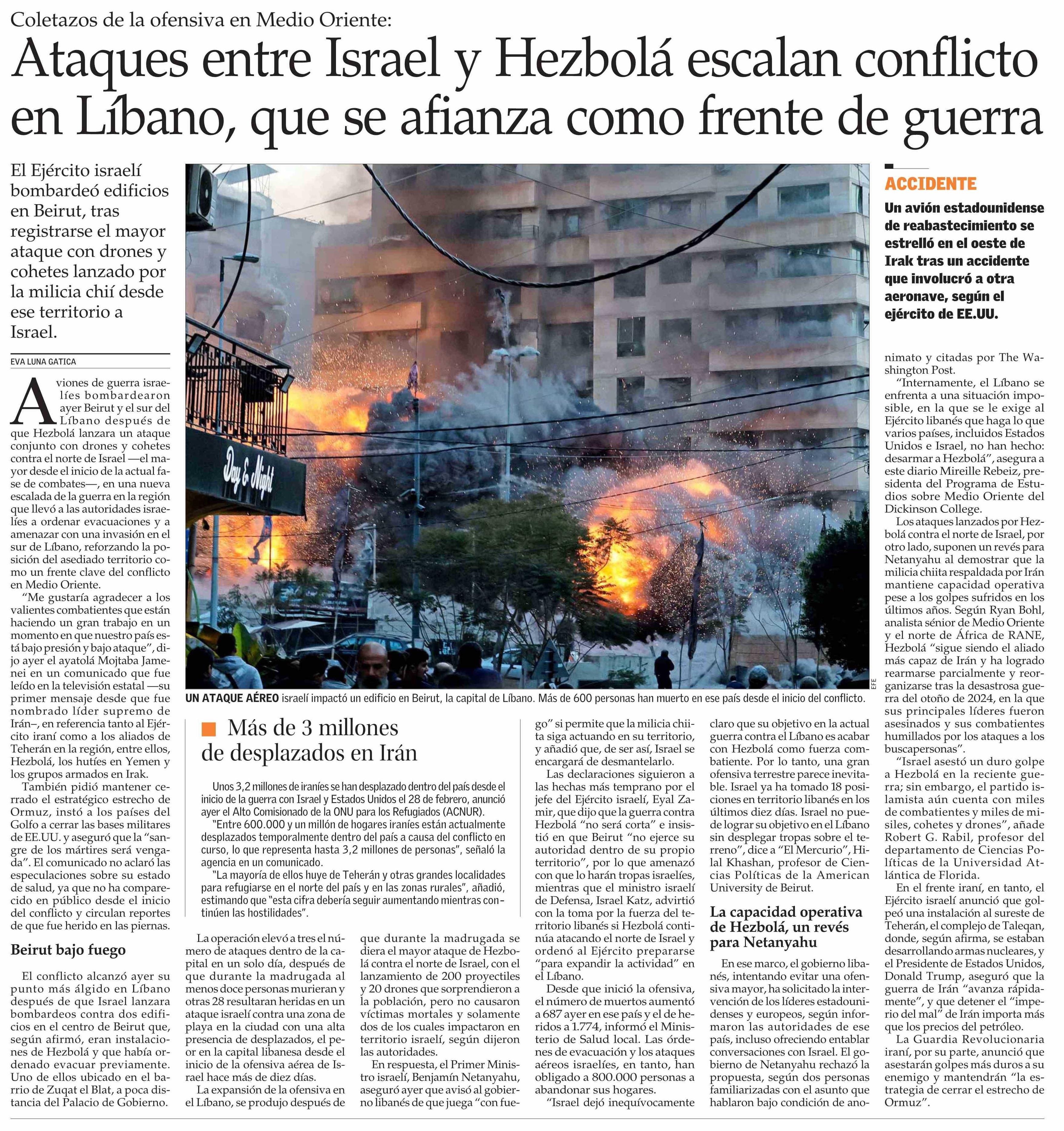 | Título: | Ataques entre Israel y Hezbolá escalan conflicto en Líbano, que se afianza como frente de guerra |