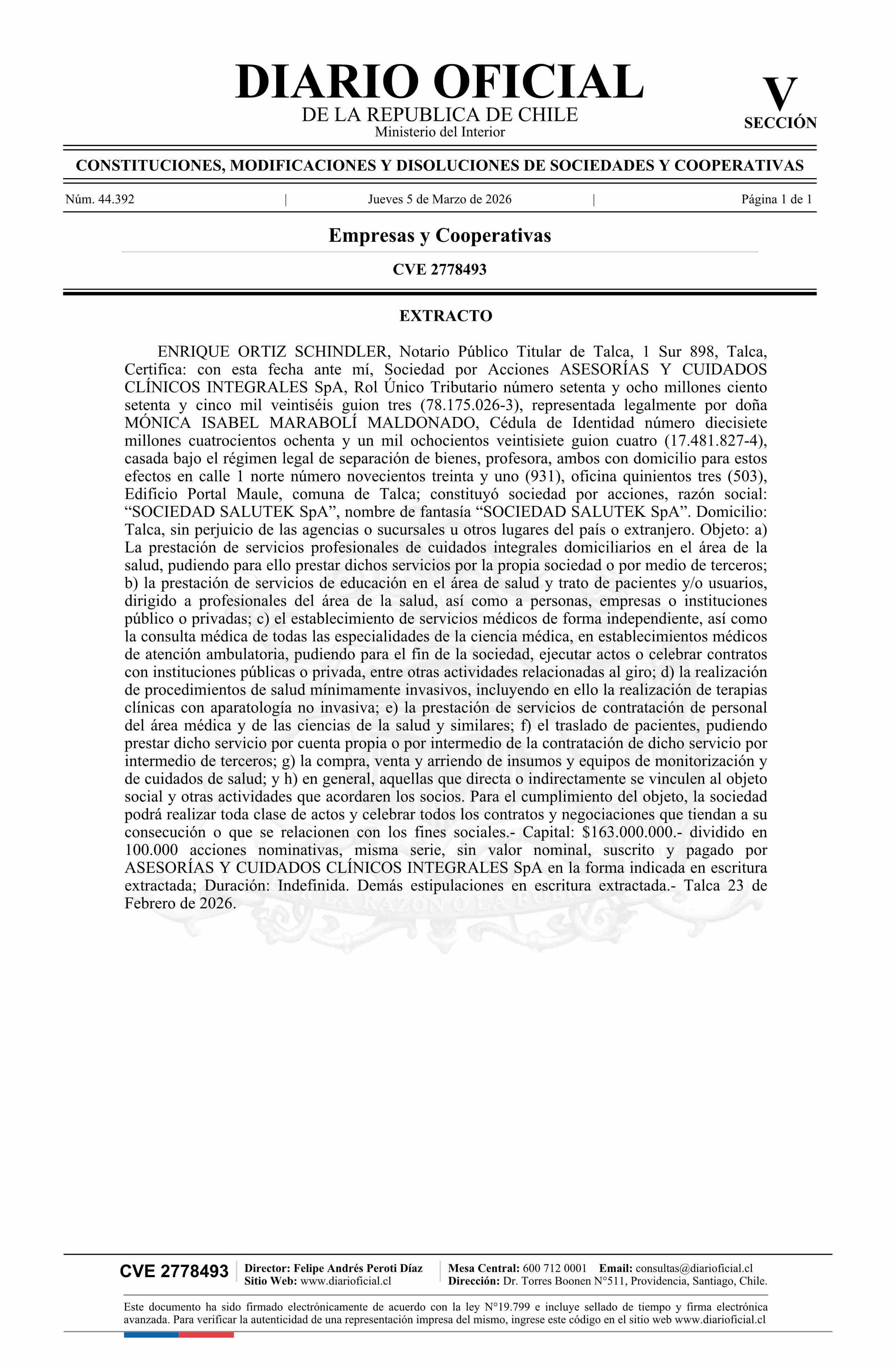 Sociedad Salutek SpA 05-03-2026 Diario Oficial Edición Electrónica |