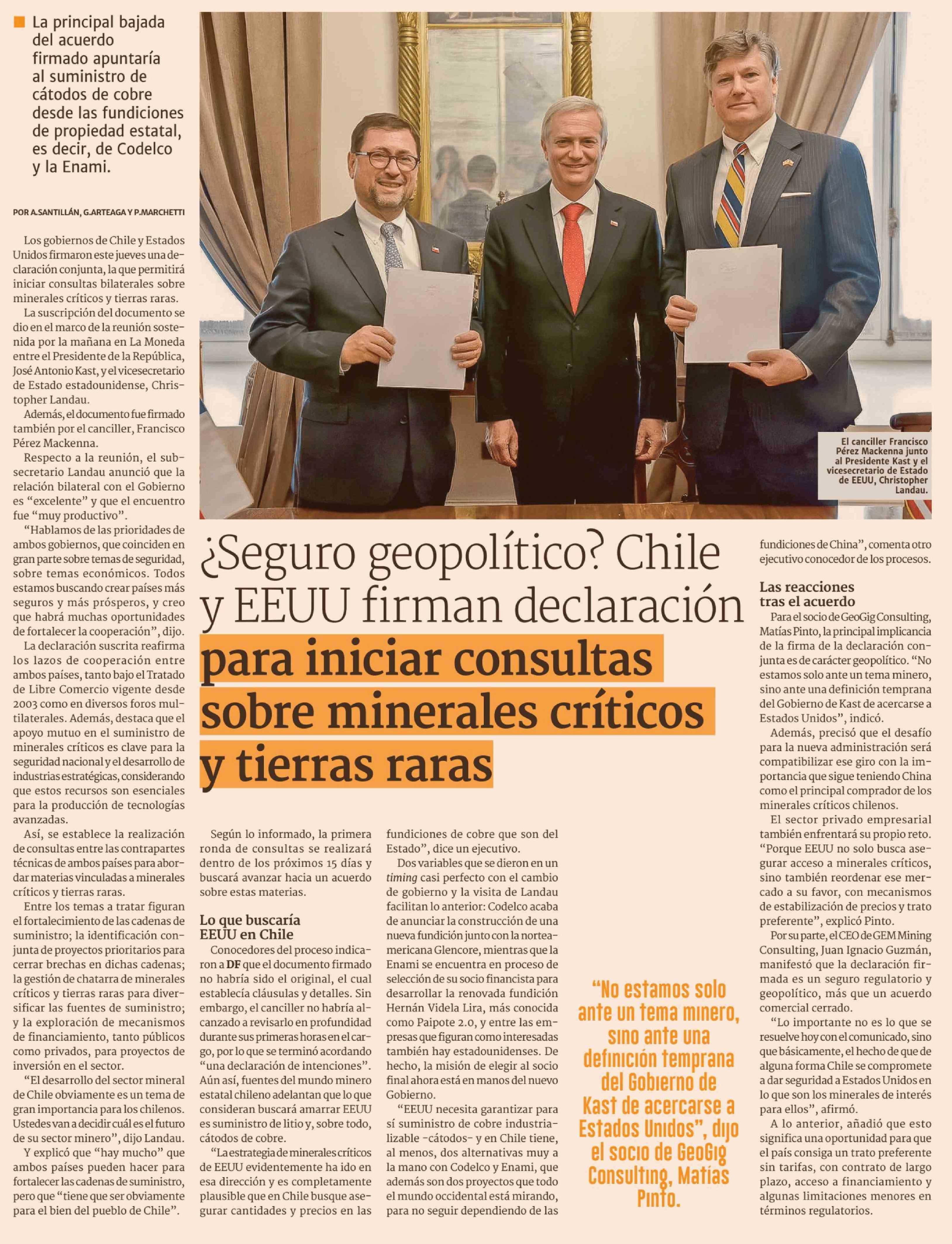 ¿Seguro geopolítico? Chile y EEUU firman declaración para iniciar consultas sobre minerales críticos y tierras raras 13-03-2026 Diario Financiero |