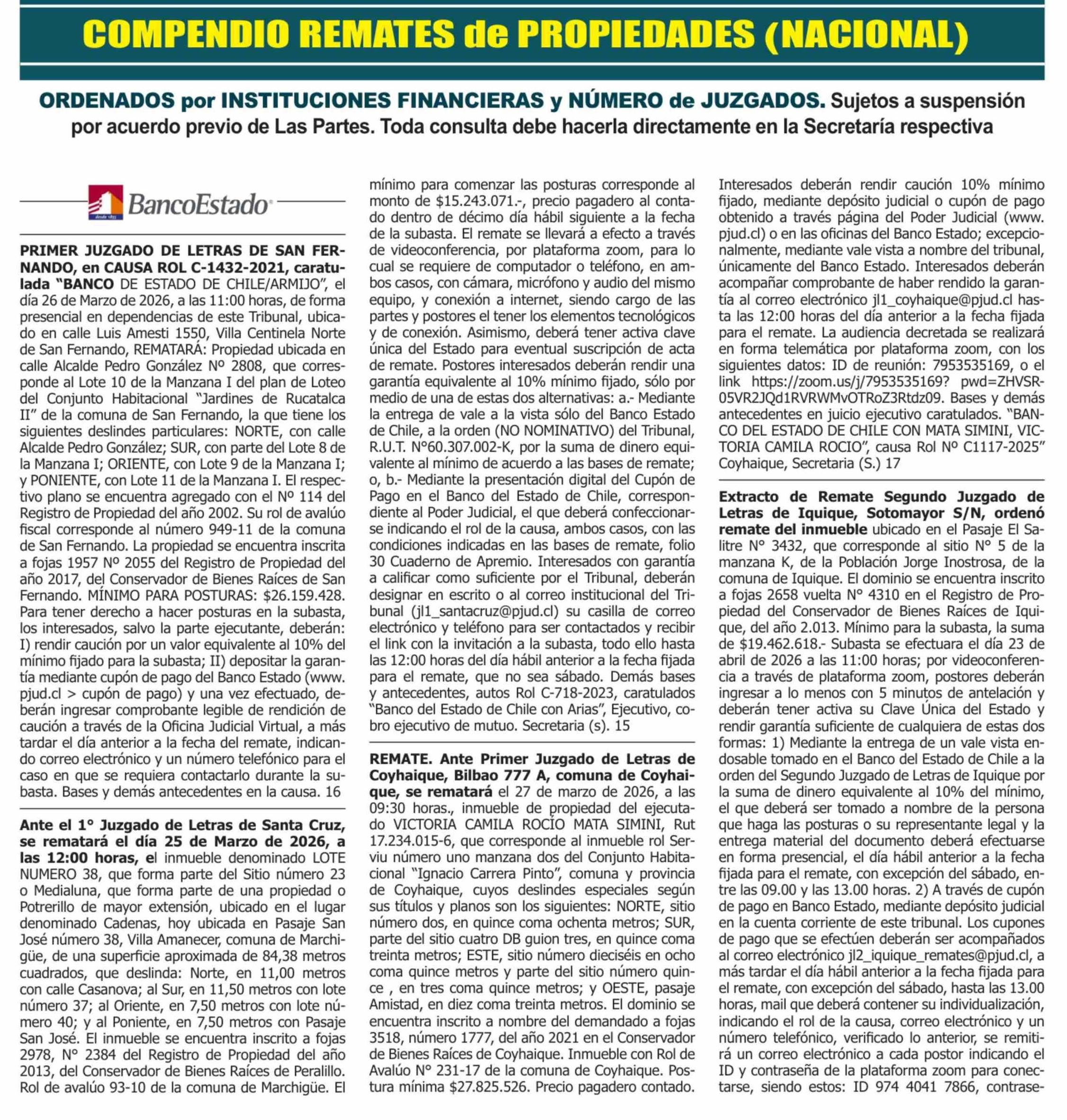 Remates: COMPENDIO REMATES de PROPIEDADES (NACIONAL) 15-03-2026 P&L Públicos y Legales |