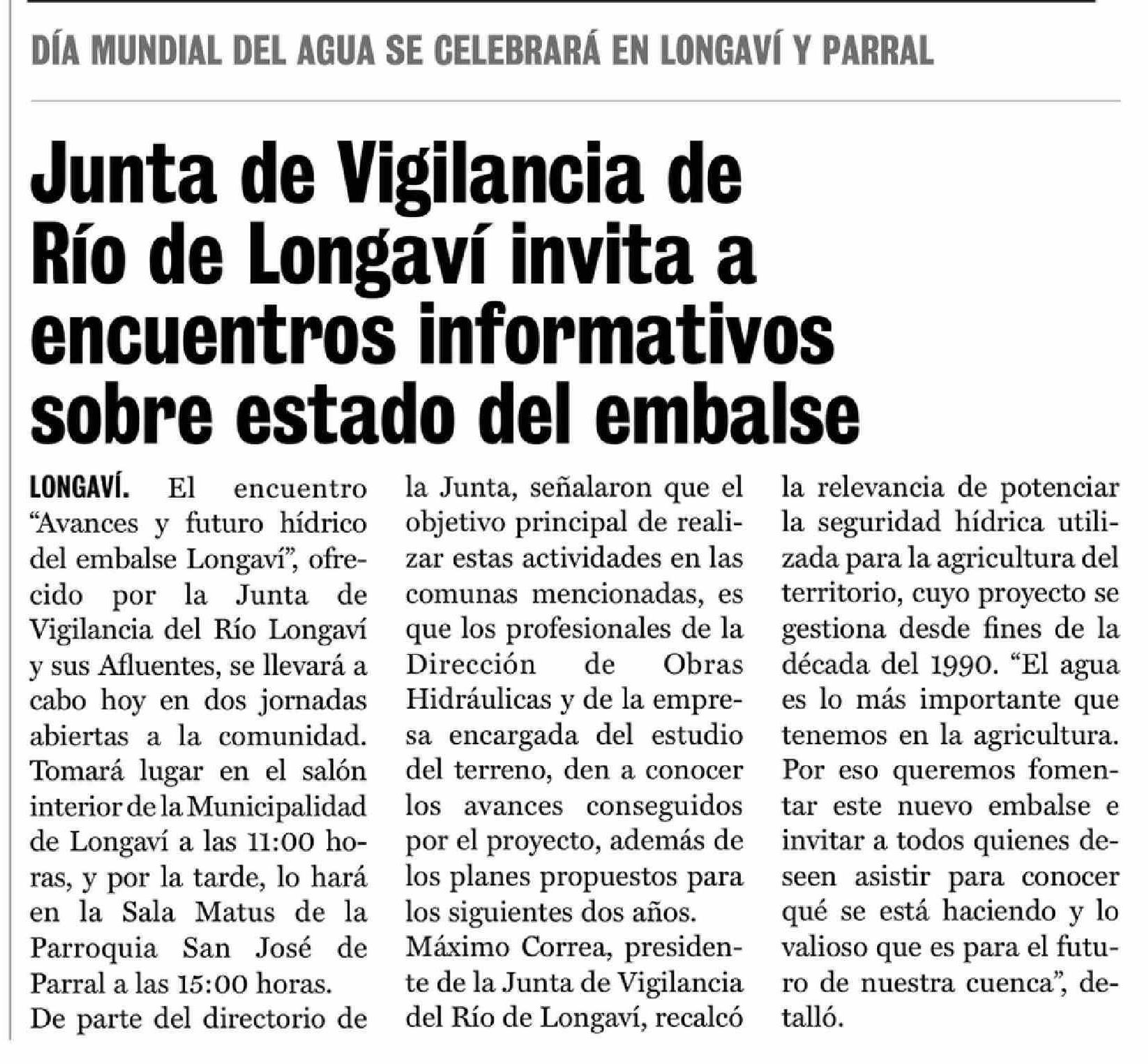 | Título: | Junta de Vigilancia de Río de Longaví invita a encuentros informativos sobre estado del embalse |