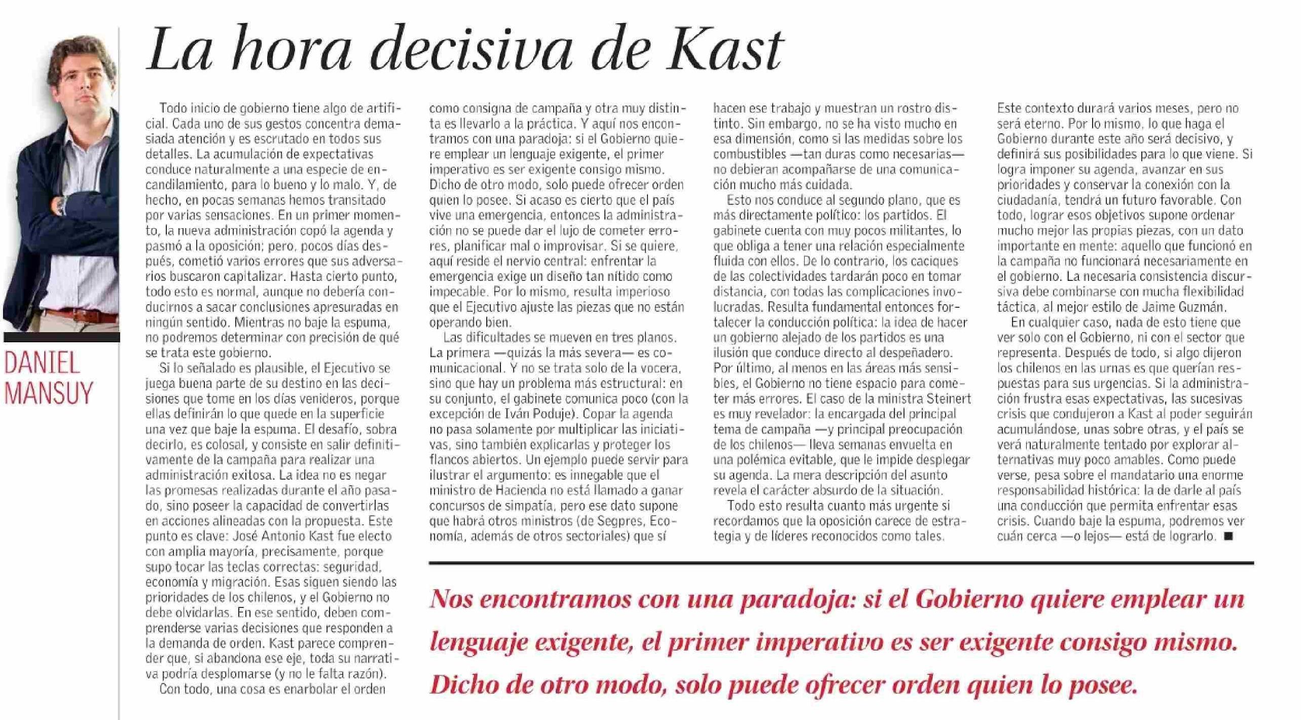 COLUMNAS DE OPINIÓN: La hora decisiva de Kast 05-04-2026 El Mercurio |