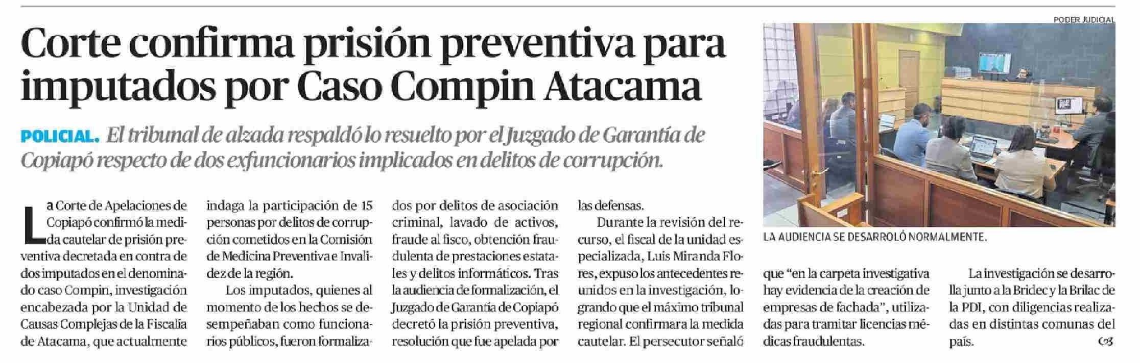 | Título: | Corte confirma prisión preventiva para imputados por Caso Compin Atacama |