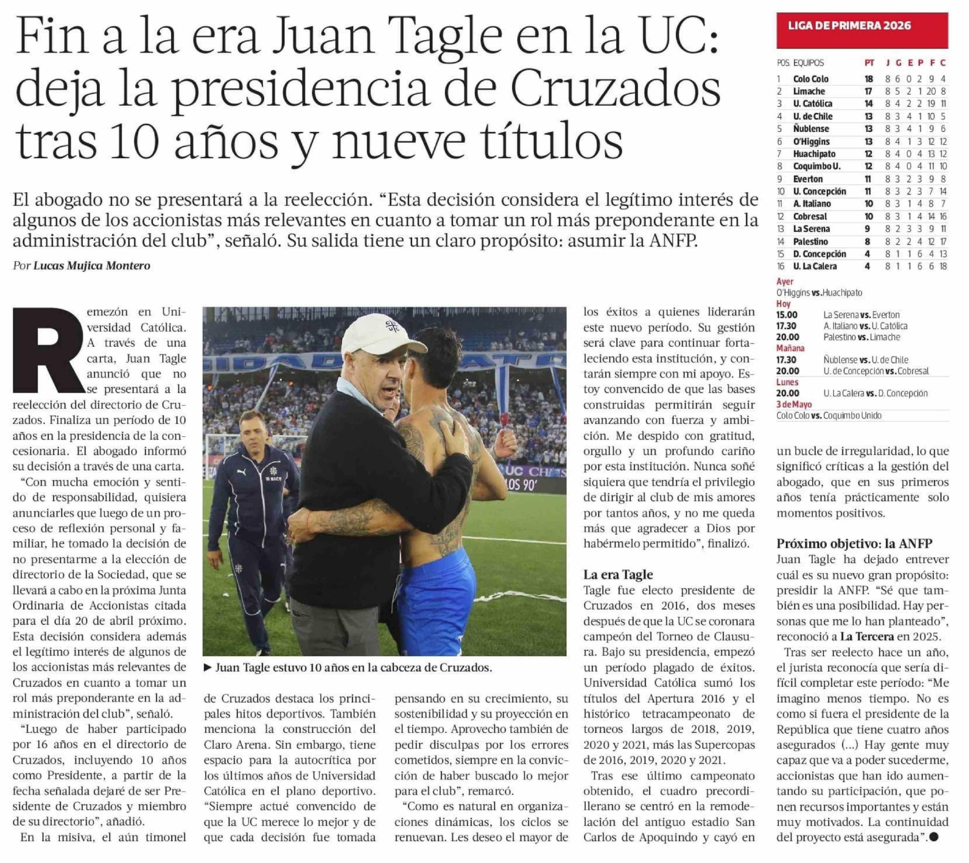 Fin a la era Juan Tagle en la UC: deja la presidencia de Cruzados tras 10 años y nueve títulos 11-04-2026 La Tercera |