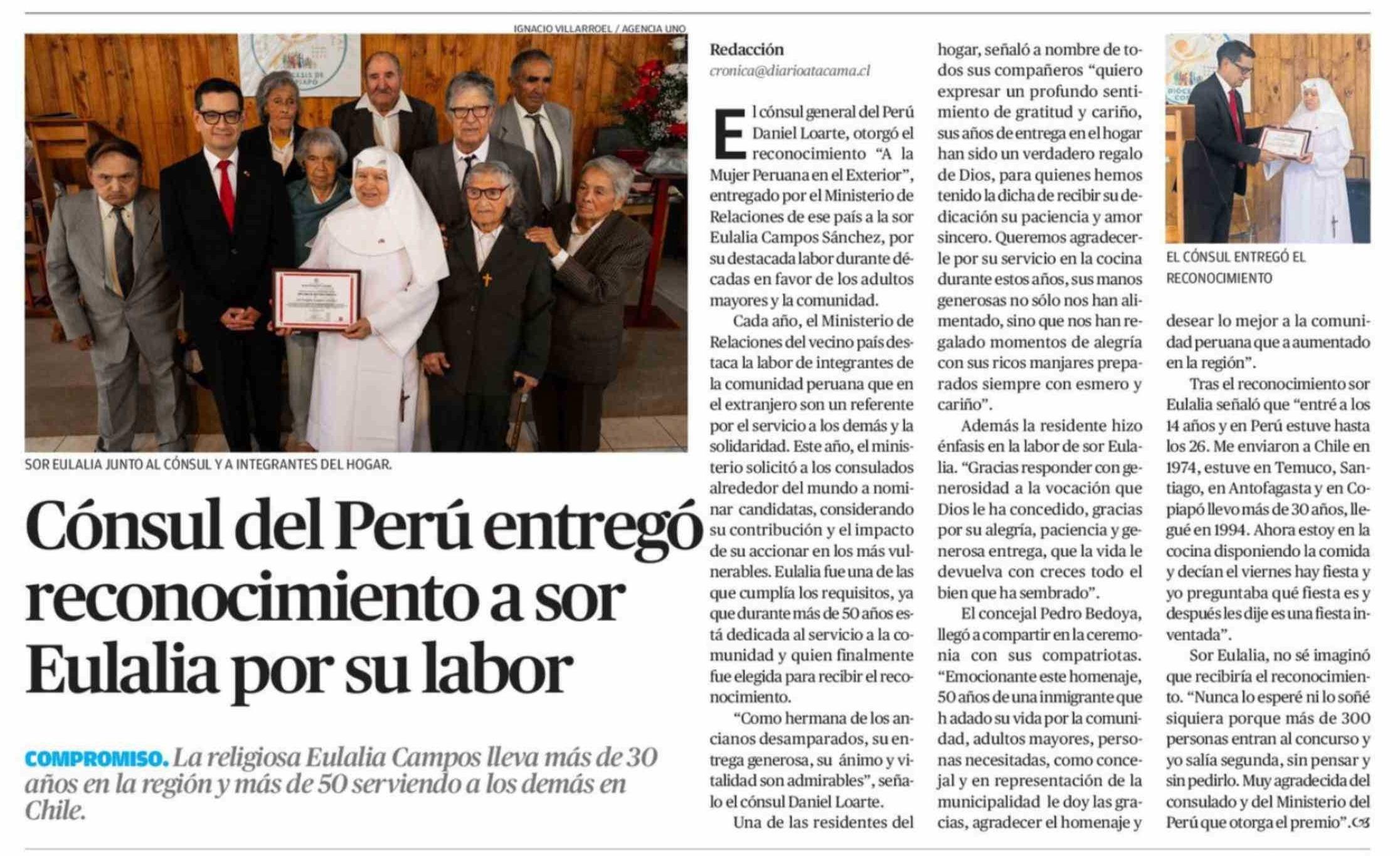 Título: Cónsul del Perú entregó reconocimiento a sor Eulalia por su labor