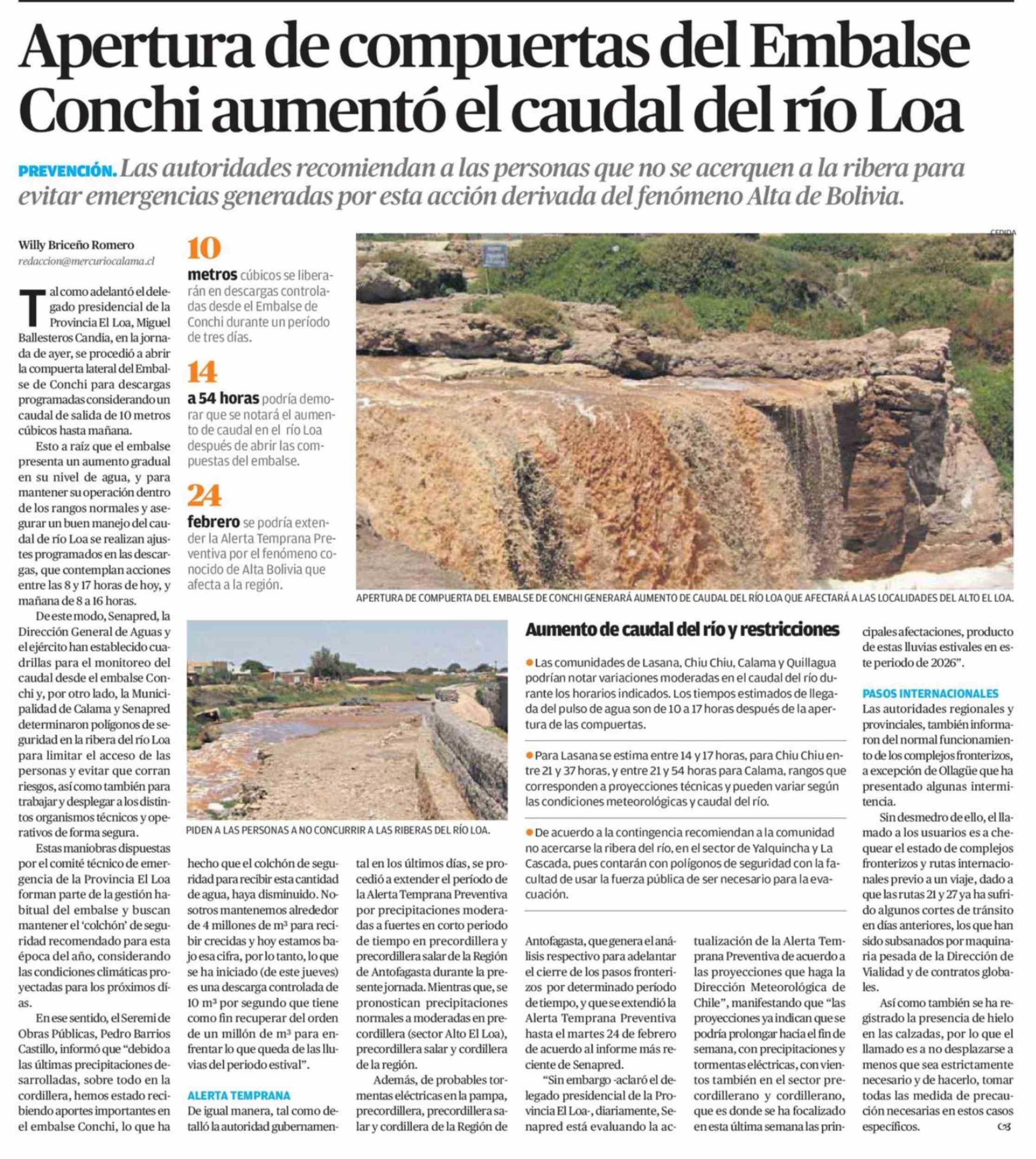 Apertura de compuertas del Embalse Conchi aumentó el caudal del río Loa 20-02-2026 El Mercurio de Calama |