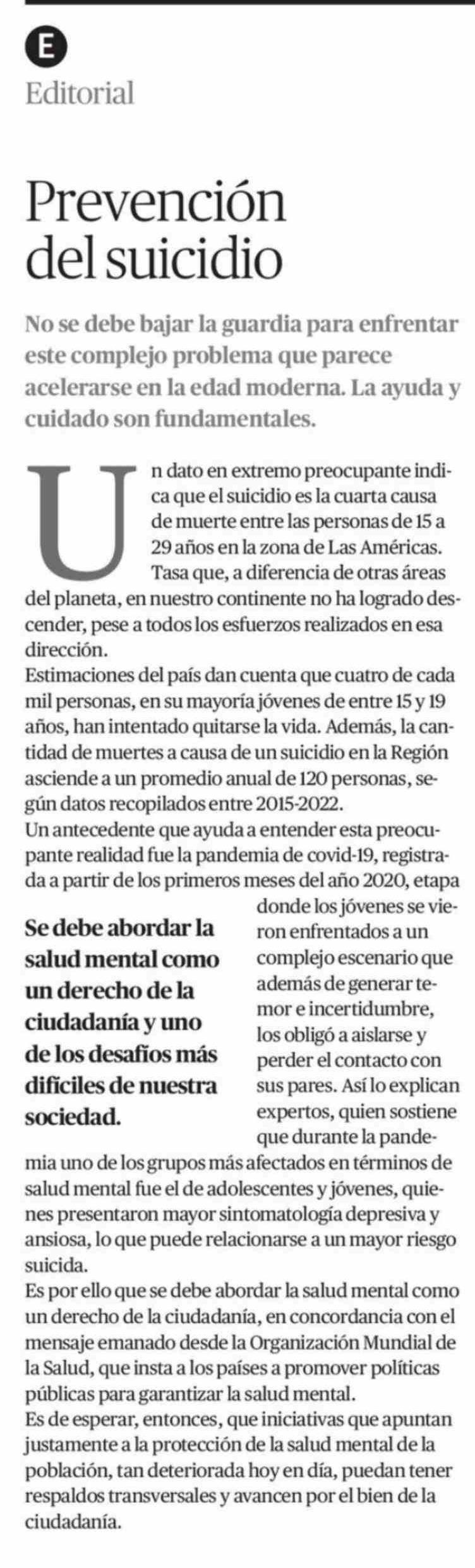 Editorial: Prevención del suicidio 15-04-2026 El Mercurio de Calama |
