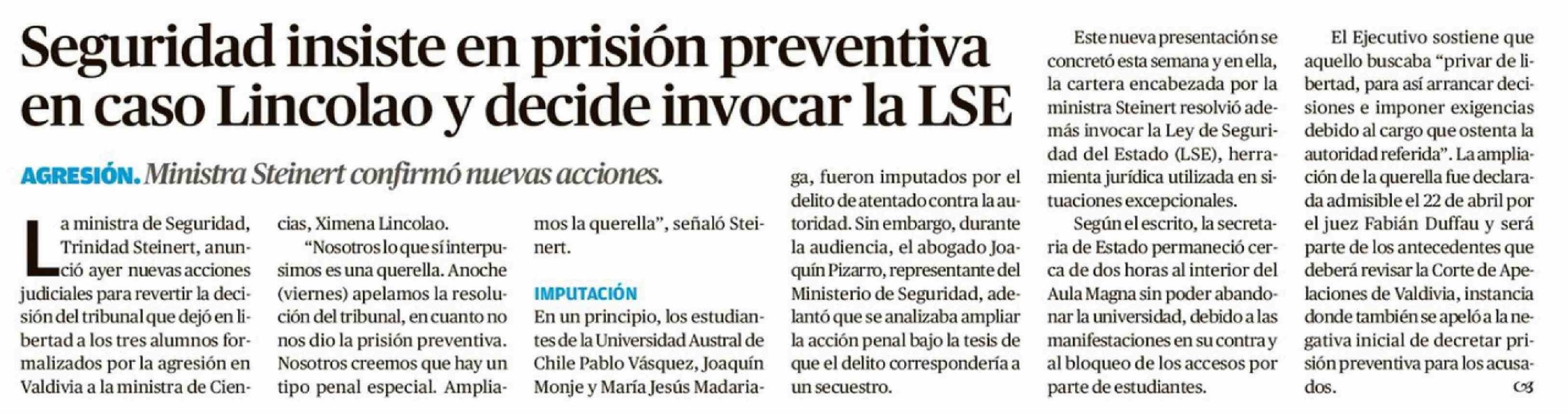 Seguridad insiste en prisión preventiva en caso Lincolao y decide invocar la LSE 26-04-2026 El Mercurio de Valparaíso |