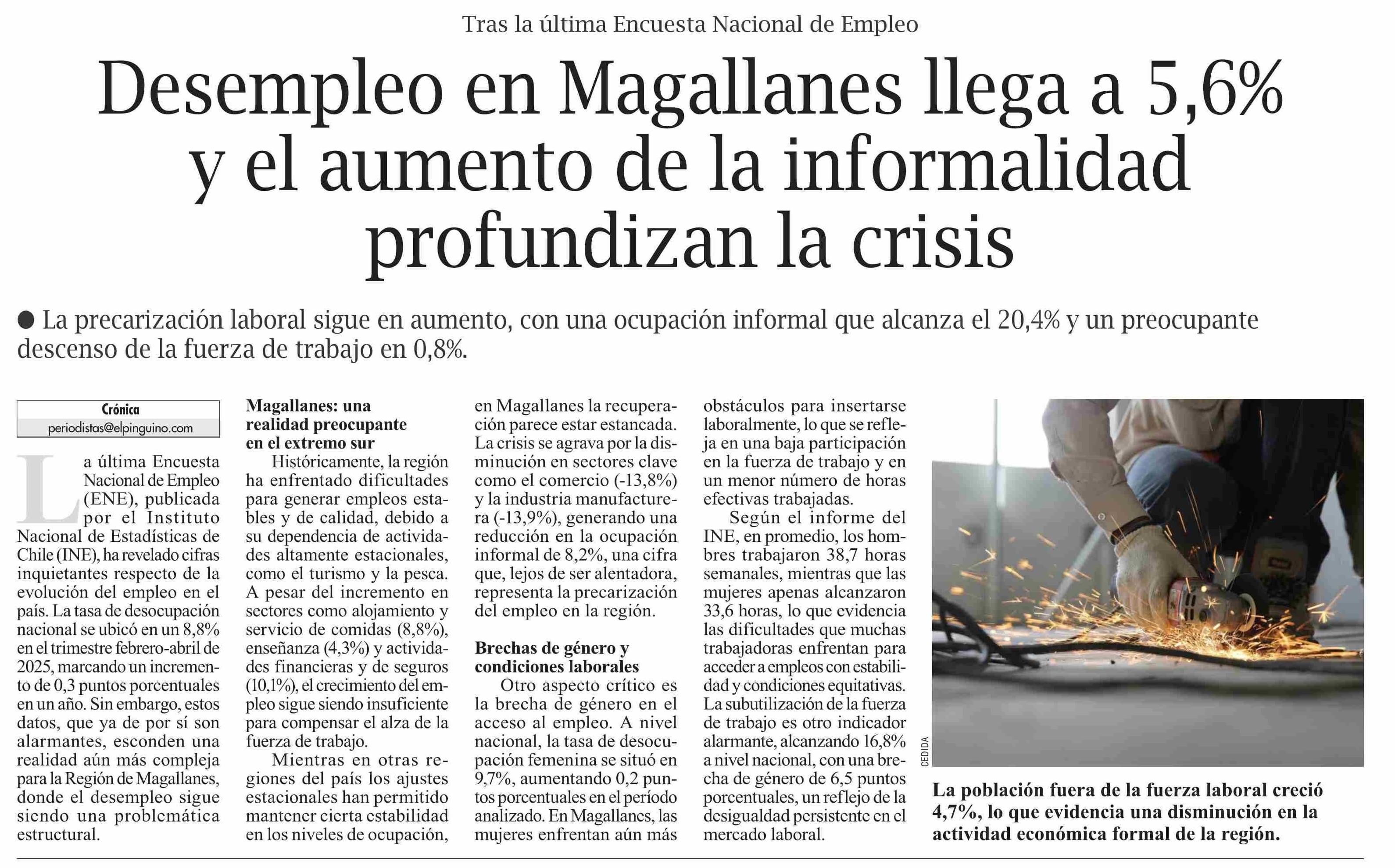 Desempleo en Magallanes llega a 5,6% y el aumento de la informalidad profundizan la crisis 31-05-2025 El Pingüino |