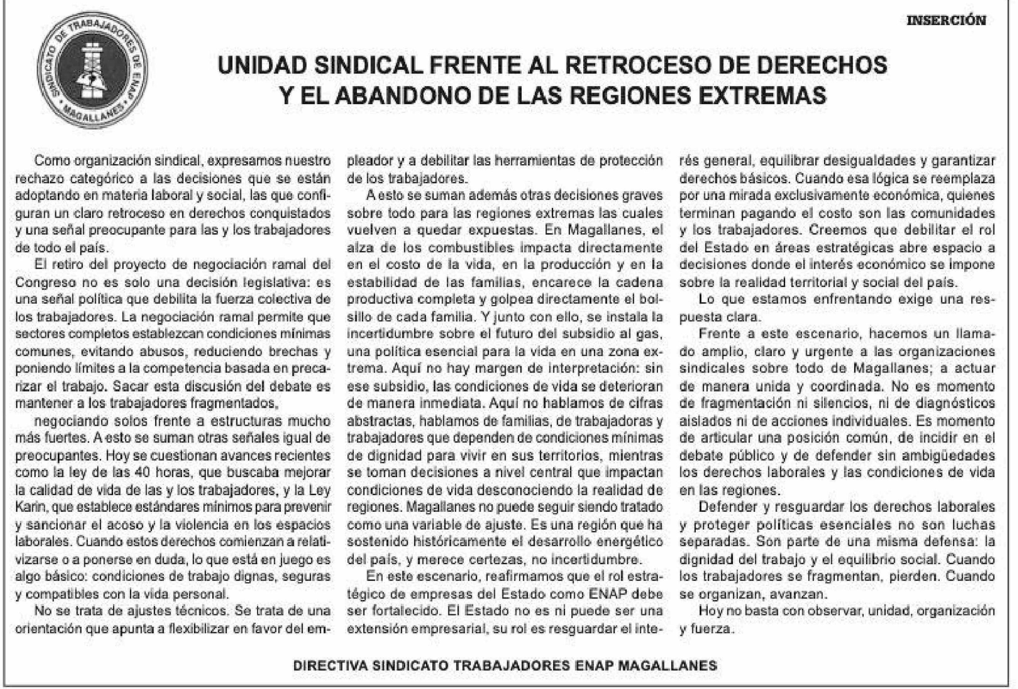 UNIDAD SINDICAL FRENTE AL RETROCESO DE DERECHOS Y EL ABANDONO DE LAS REGIONES EXTREMAS 07-04-2026 La Prensa Austral |