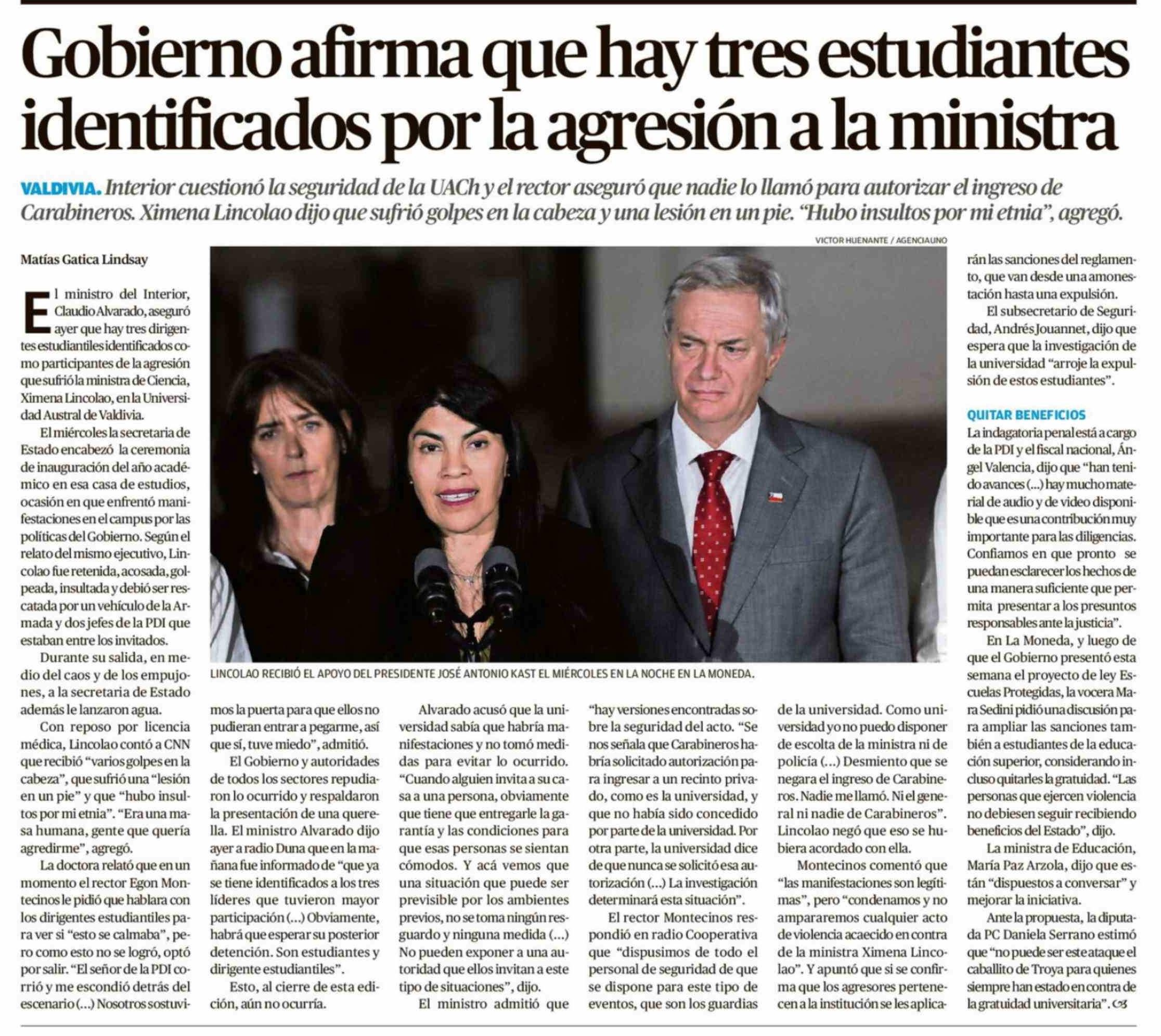 Gobierno afirma que hay tres estudiantes identificados por la agresión a la ministra 10-04-2026 El Austral de Osorno |