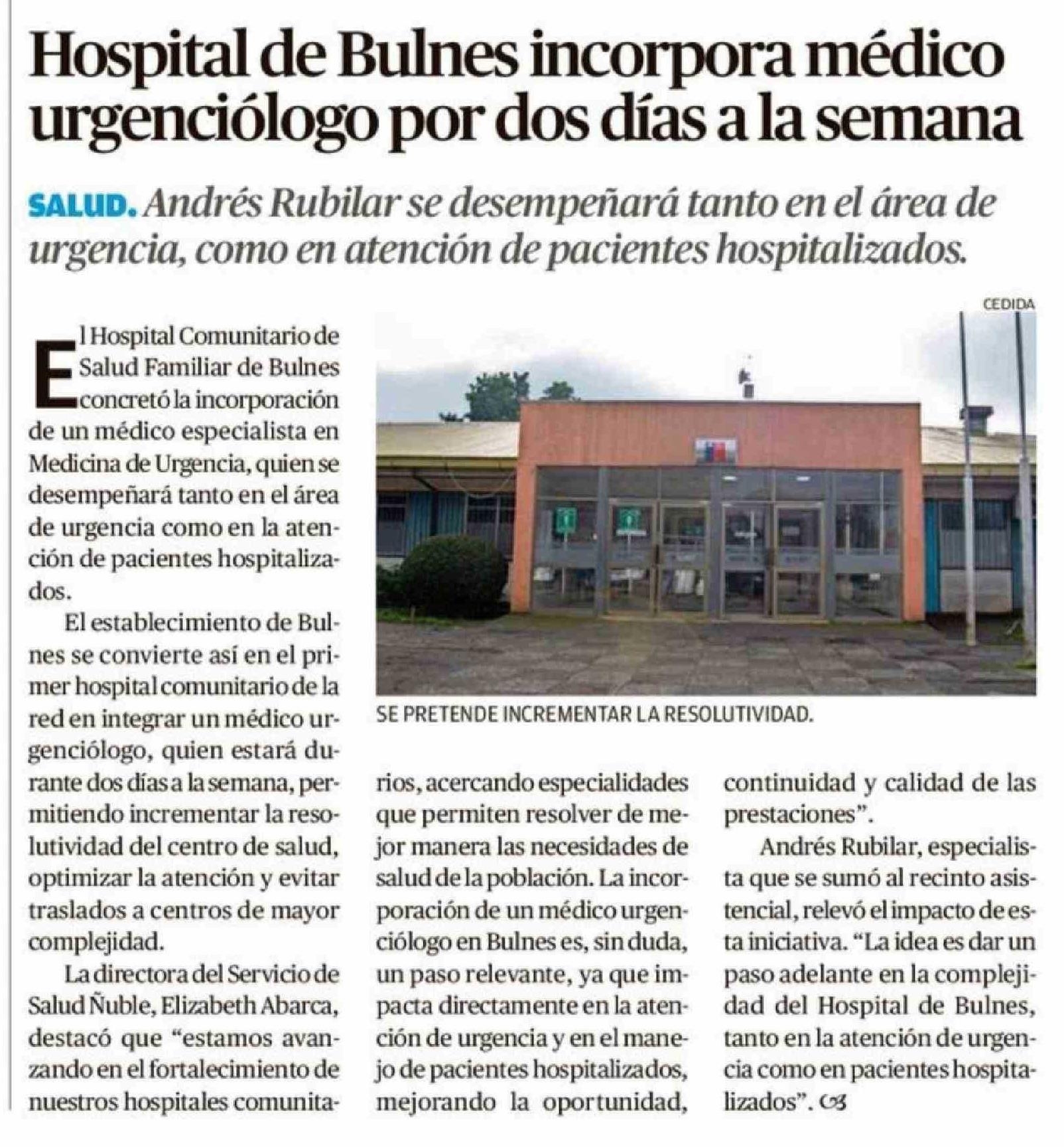Título: Hospital de Bulnes incorpora médico urgenciólogo por dos días a la semana