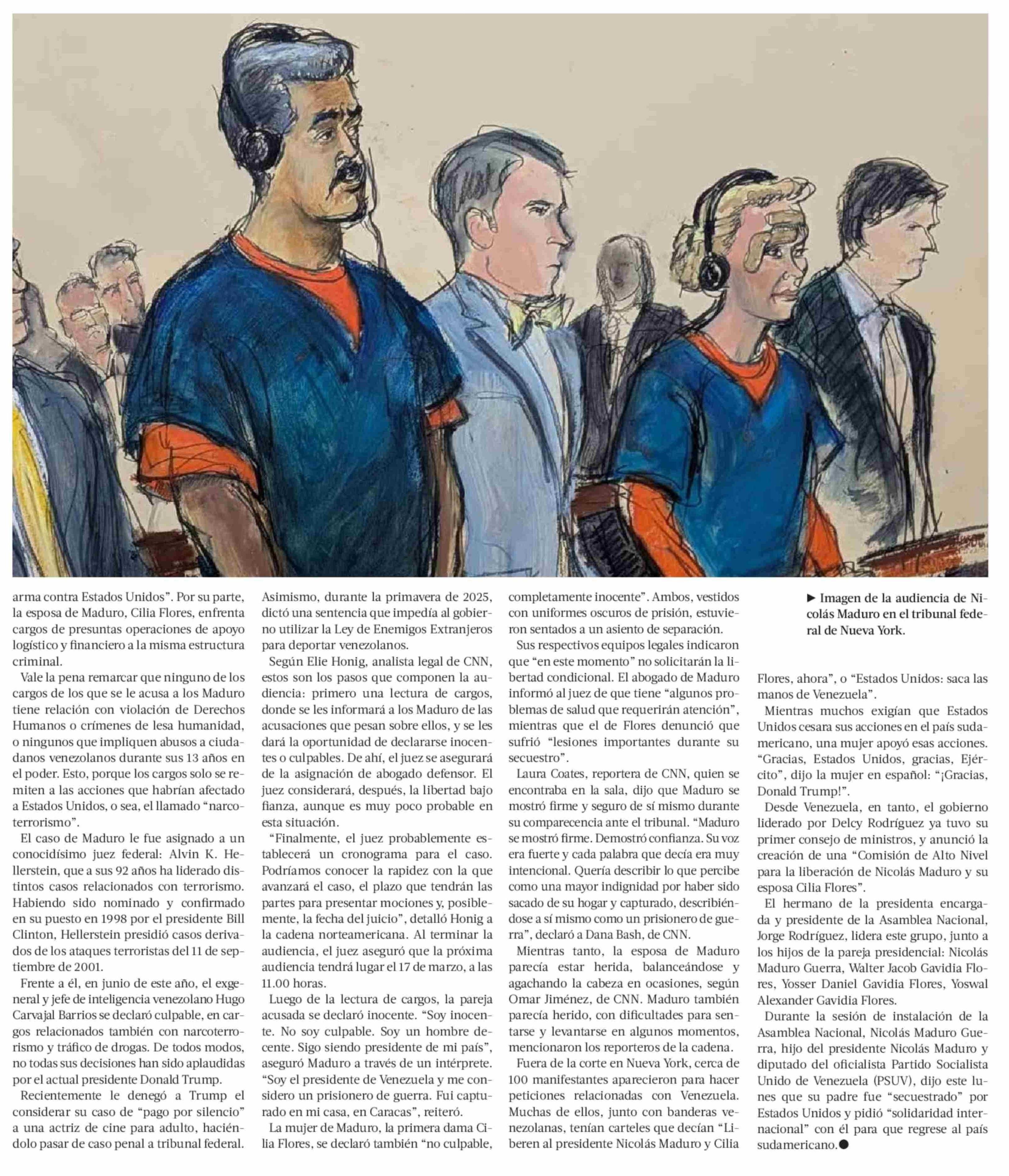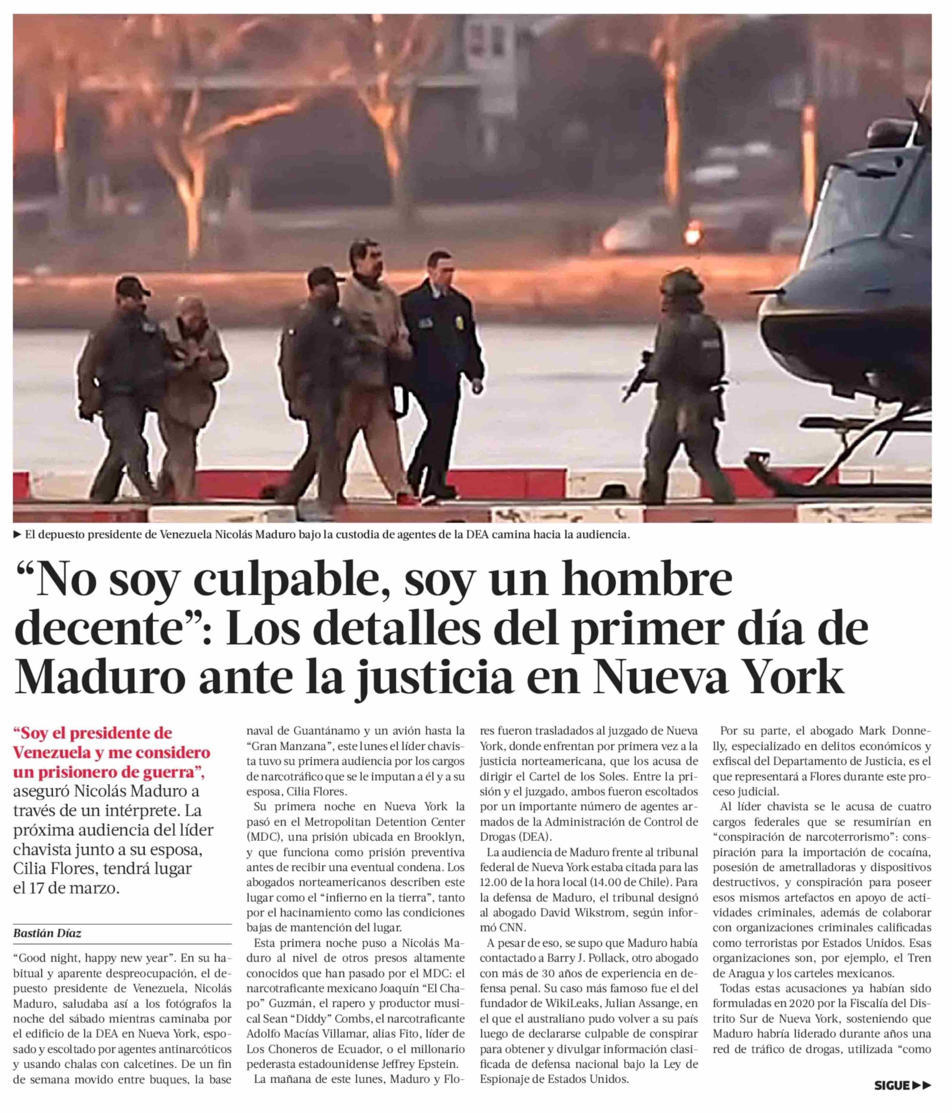 "No soy culpable, soy un hombre decente": Los detalles del primer día de Maduro ante la justicia en Nueva York 06-01-2026 La Tercera |