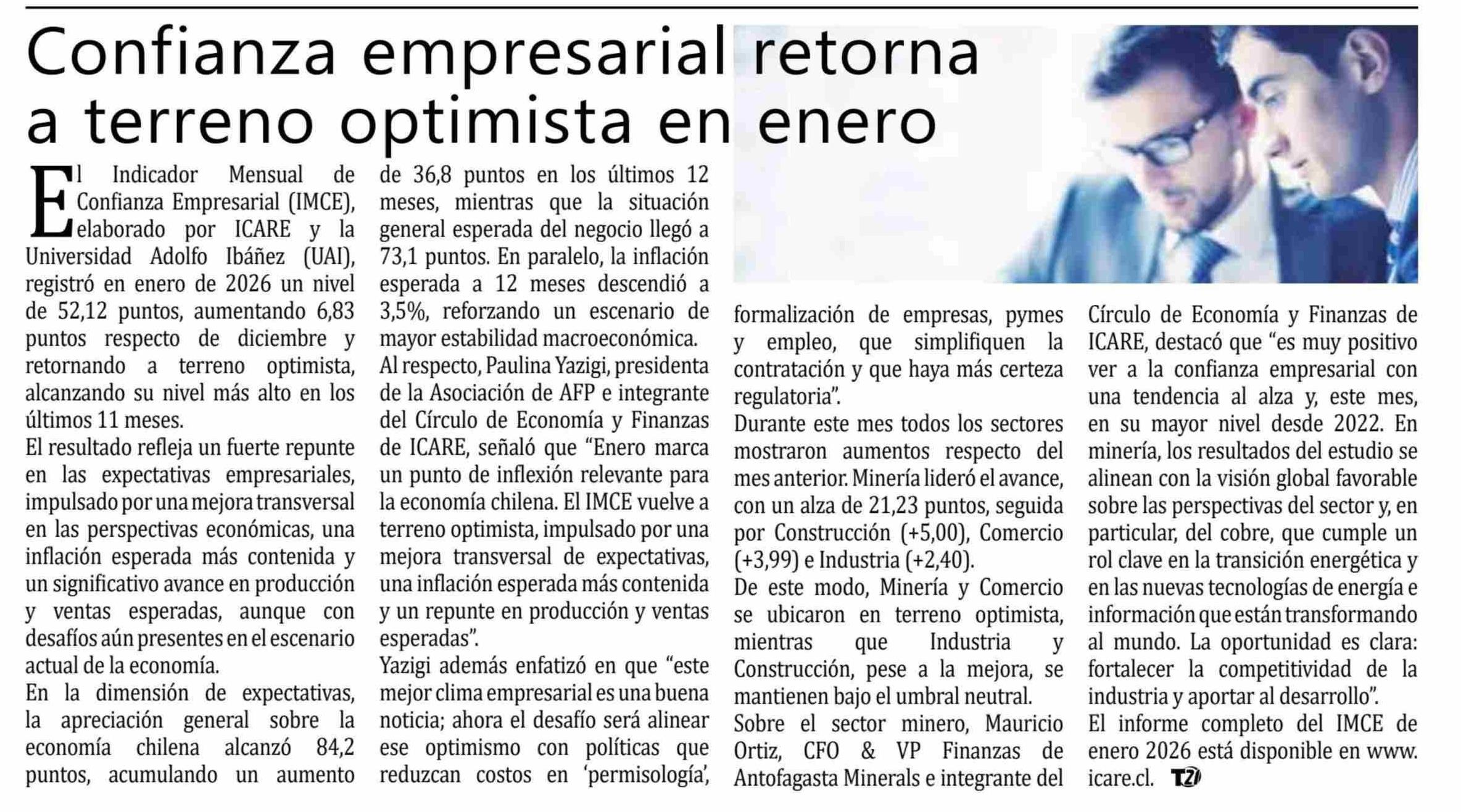 | Título: | Confianza empresarial retorna a terreno optimista en enero Indicador Mensual de de 36,8 puntos en los últimos 12 |