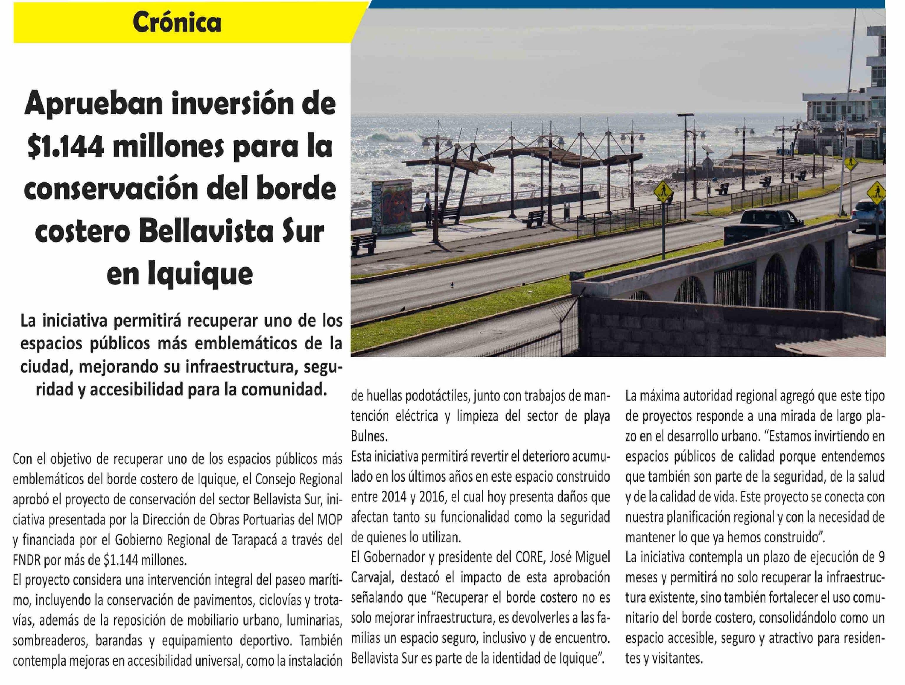 Aprueban inversión de $1.144 millones para la conservación del borde costero Bellavista Sur en Iquique 27-03-2026 El Longino |