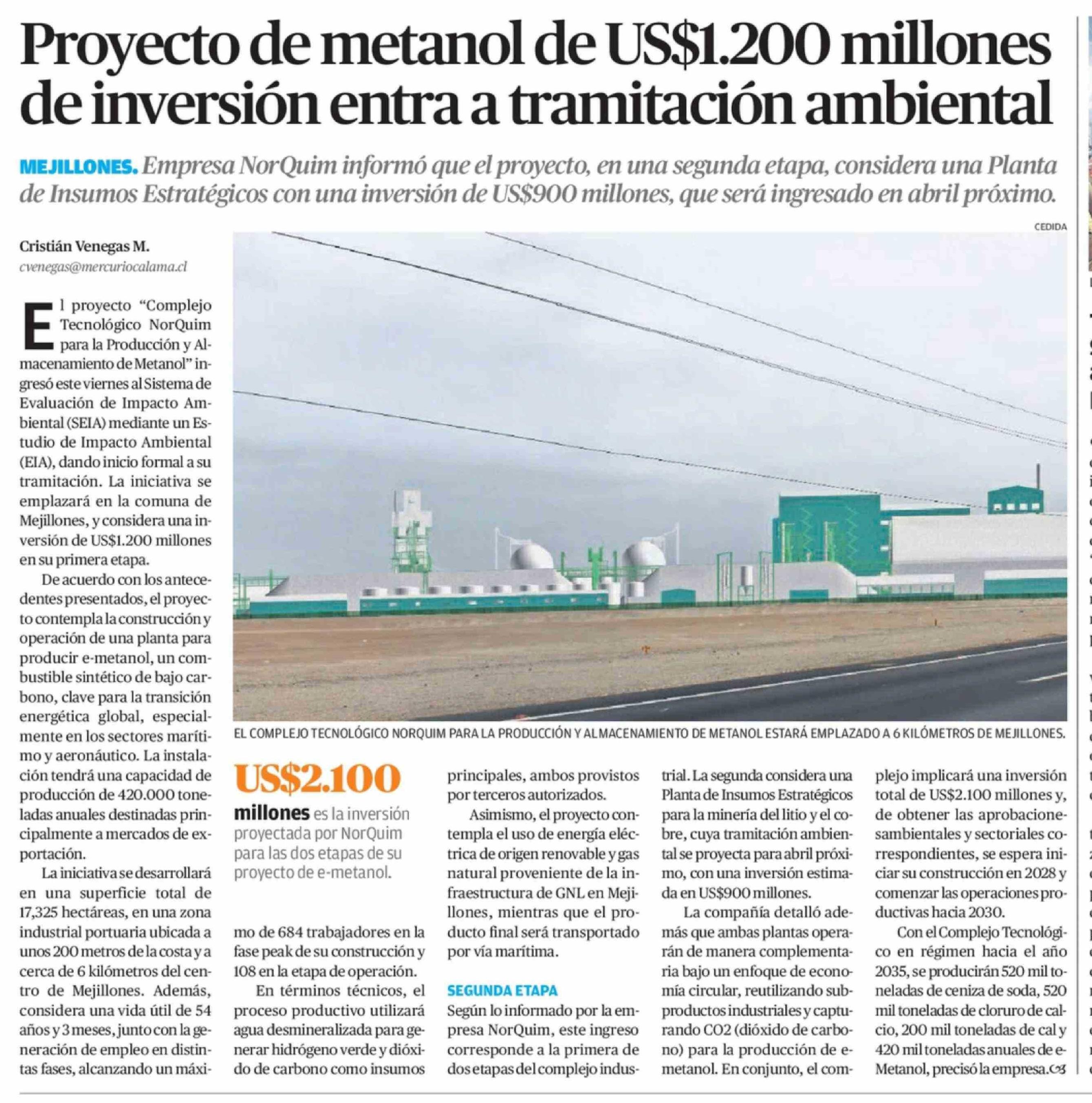 Proyecto de metanol de US$1.200 millones de inversión entra a tramitación ambiental 28-03-2026 El Mercurio de Antofagasta |
