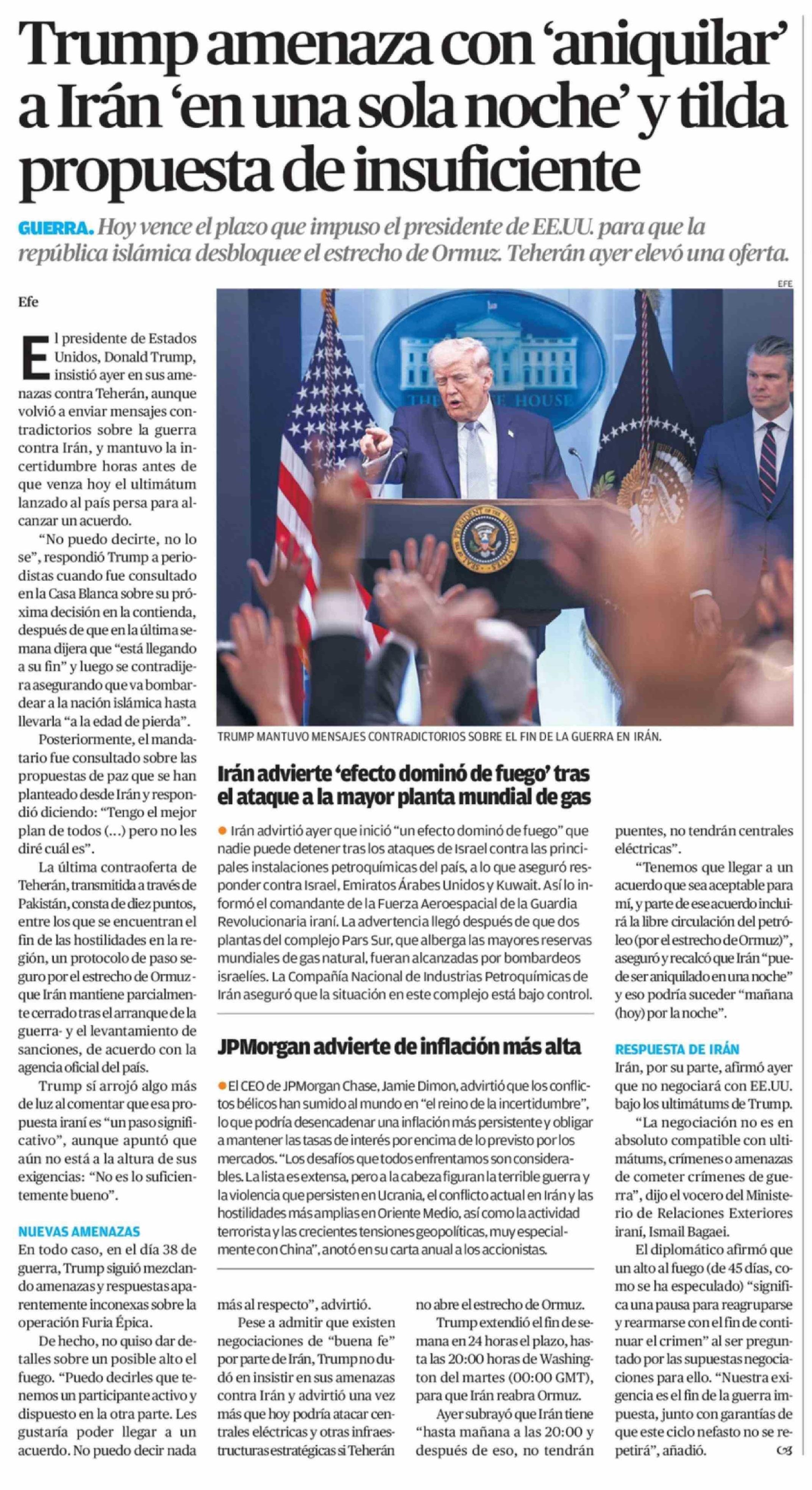 Título: Trump amenaza con 'aniquilar' a Irán 'en una sola noche' y tilda propuesta de insuficiente