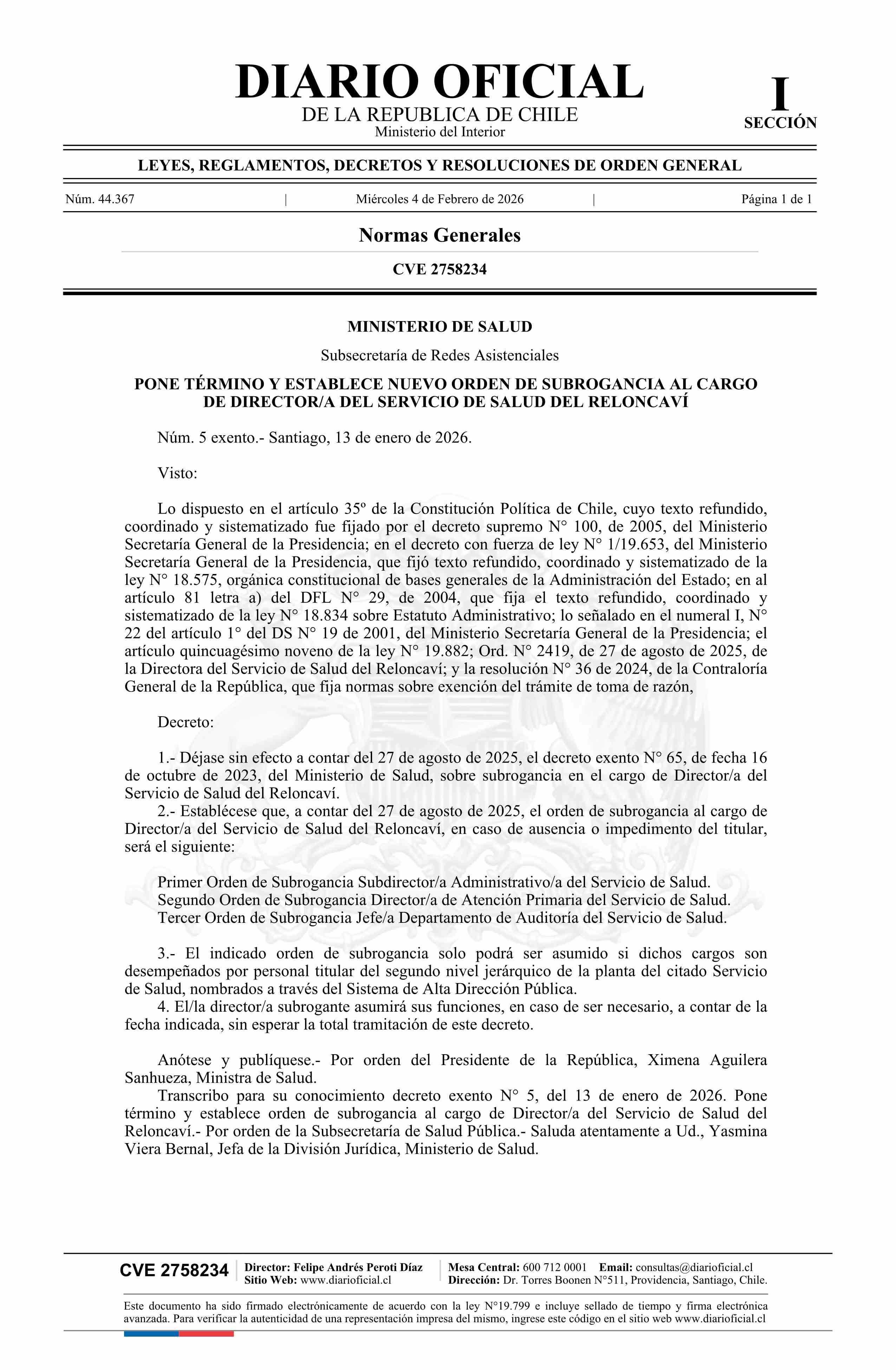 Decreto exento número 5, de 2026.- Pone término y establece nuevo orden de subrogancia al cargo de Director/a del Servicio de Salud del Reloncaví 04-02-2026 Diario Oficial Edición Electrónica |