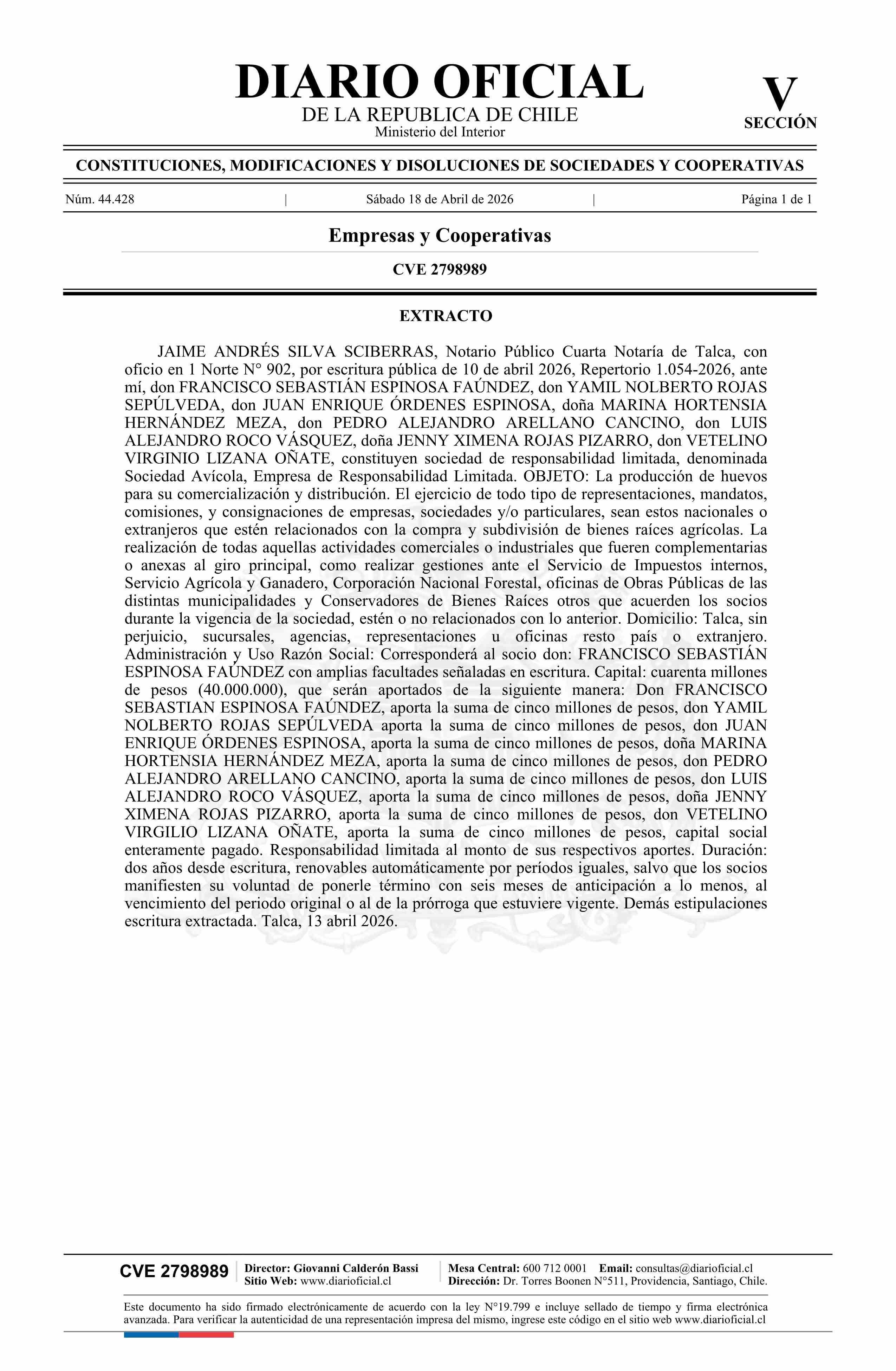 Sociedad Avícola, Empresa de Responsabilidad Limitada 18-04-2026 Diario Oficial Edición Electrónica |