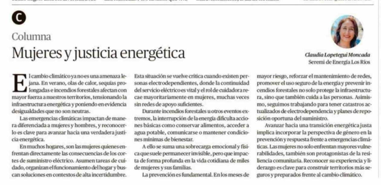 Columnas de Opinión: Mujeres y justicia energética 04-02-2026 Diario Austral Región de Los Ríos |