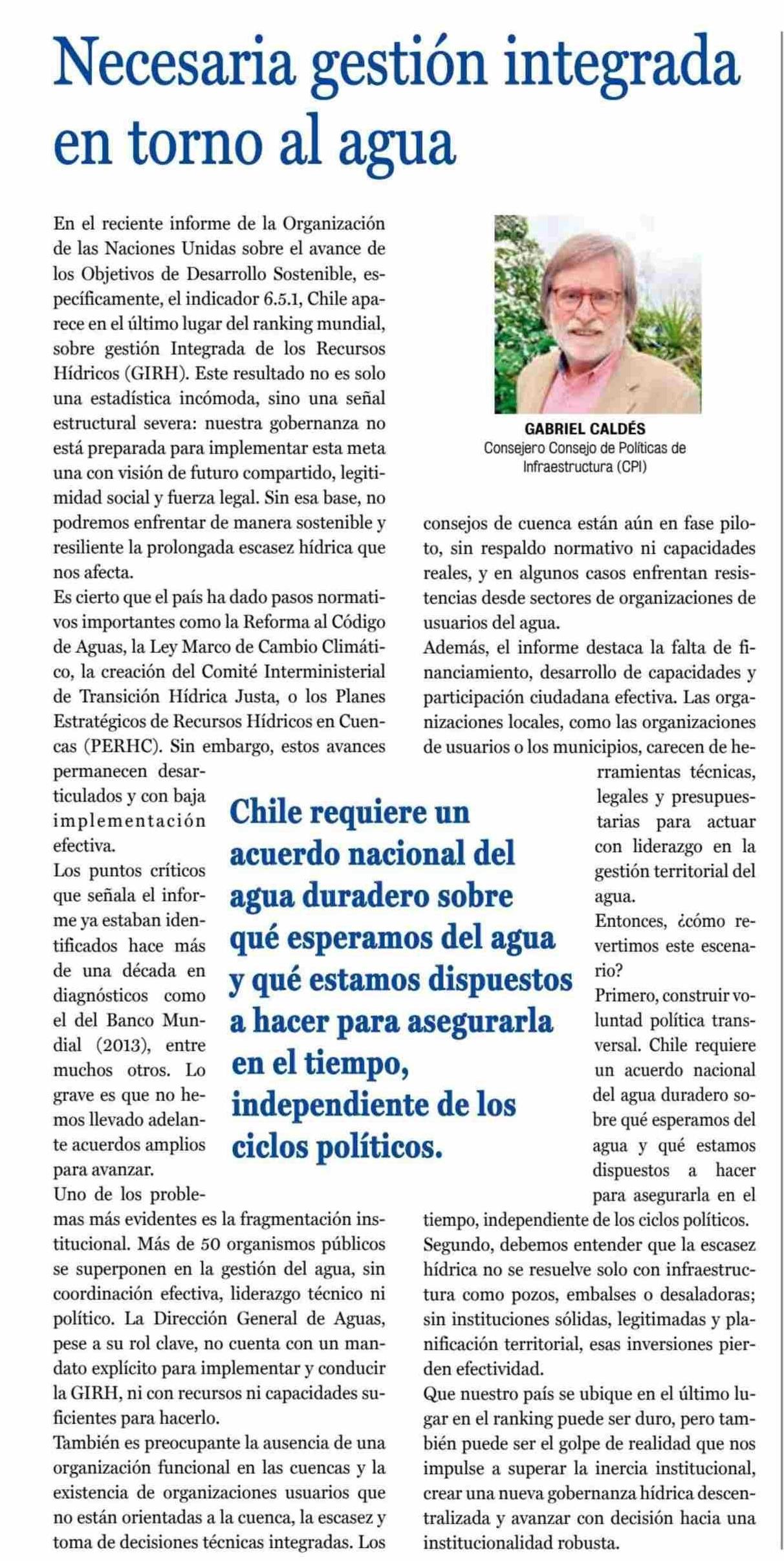 COLUMNAS DE OPINIÓN: Necesaria gestión integrada en torno al agua 10-06-2025 La Prensa de Curicó |
