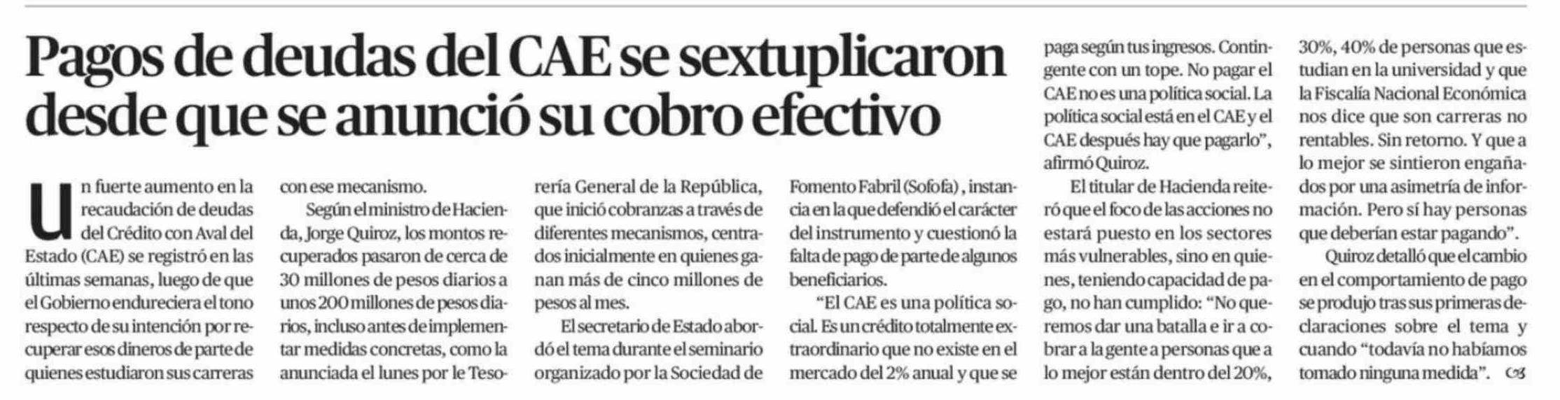 | Título: | Pagos de deudas del CAE se sextuplicaron desde que se anunció su cobro efectivo |