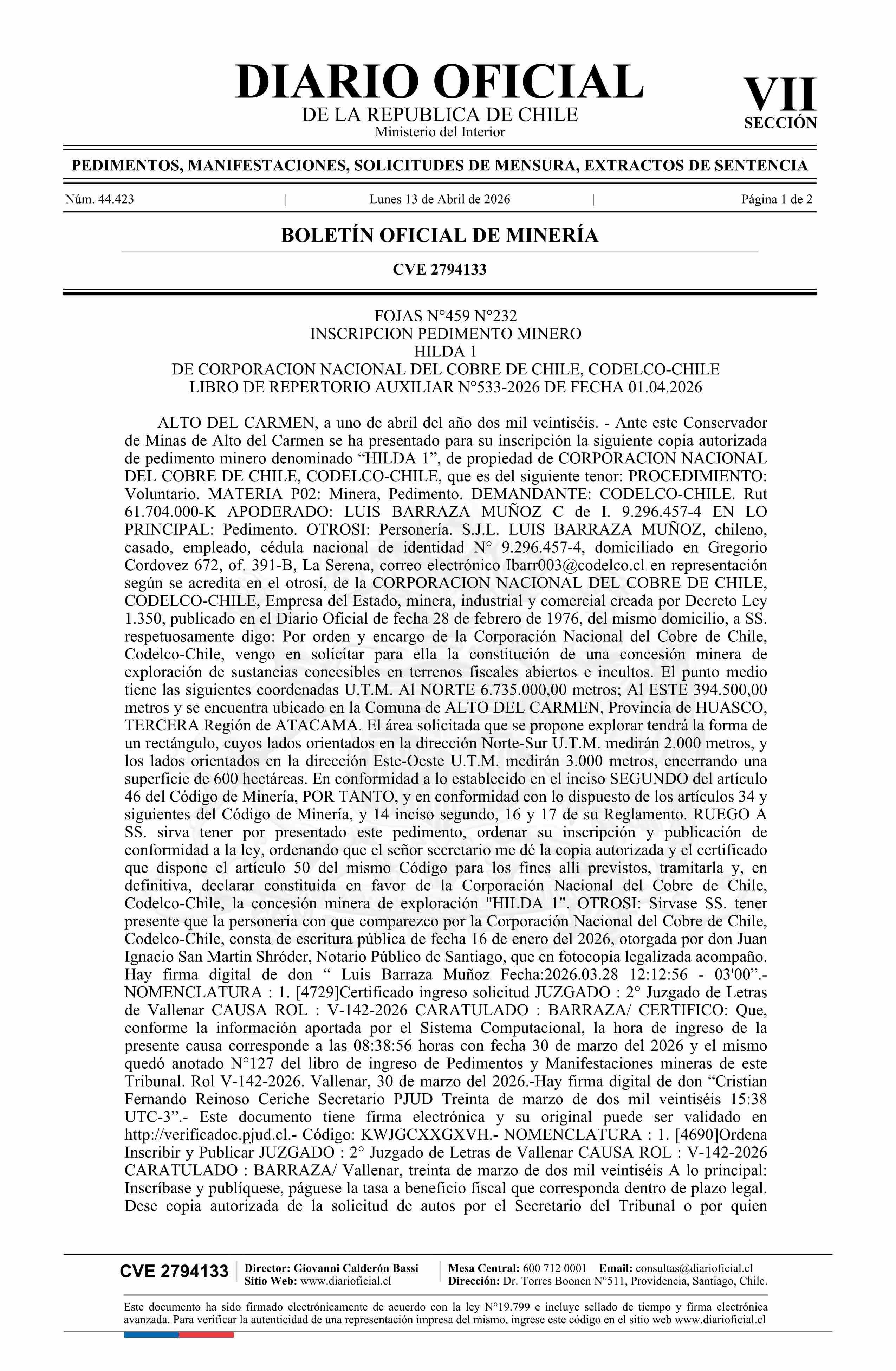 13-04-2026 DIARIO OFICIAL CHILE - BOLETÍN OFICIAL DE MINERÍA