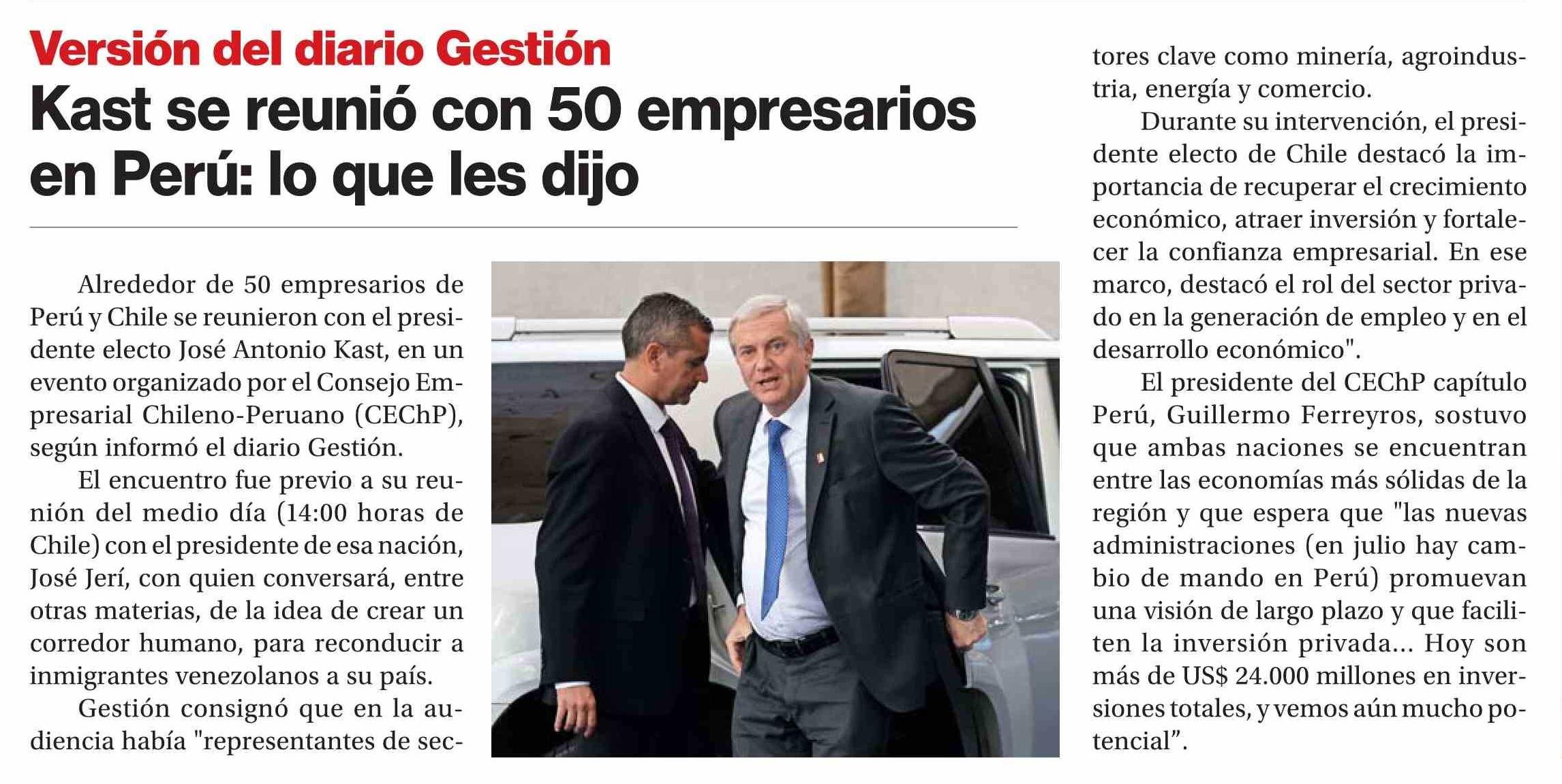 | Título: | Kast se reunió con 50 empresarios en Perú: lo que les dijo |