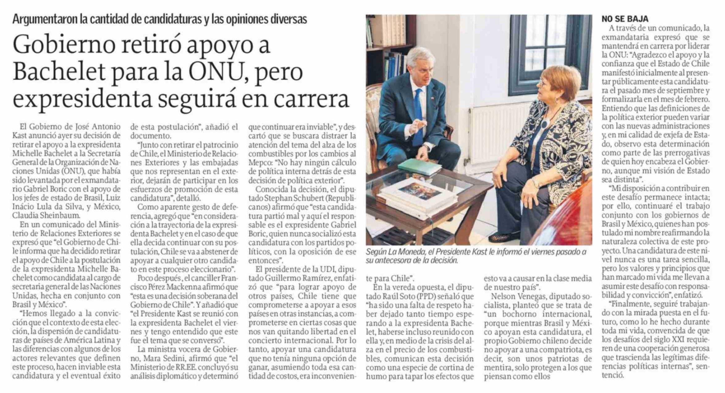 Gobierno retiró apoyo a Bachelet para la ONU, pero expresidenta seguirá en carrera 25-03-2026 El Sur |
