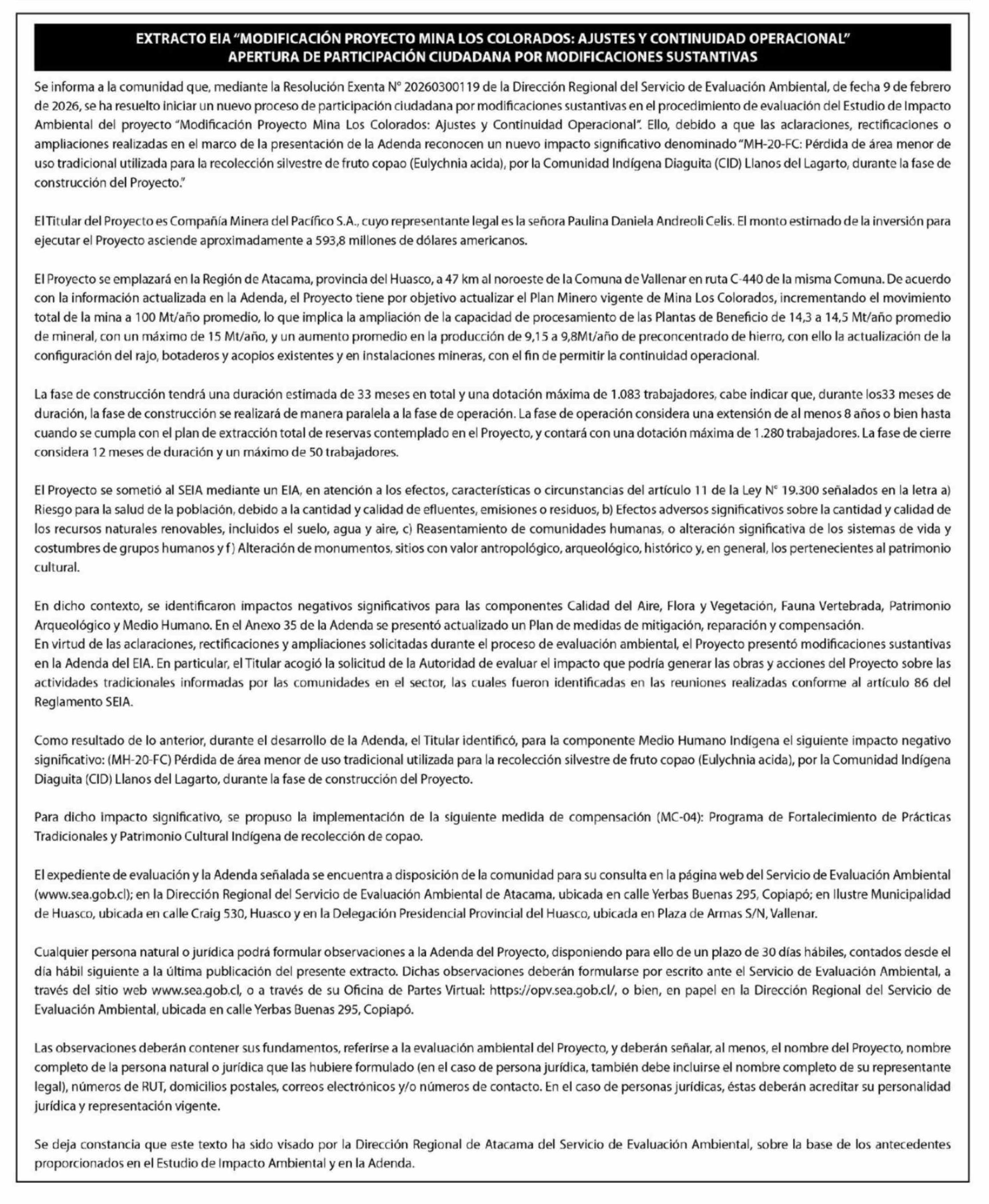 | Título: | Extractos: EXTRACTO EIA "MODIFICACIÓN PROYECTO MINA LOS COLORADOS: AJUSTES Y CONTINUIDAD OPERACIONAL" APERTURA DE PARTICIPACIÓN CIUDADANA POR MODIFICACIONES SUSTANTIVAS |