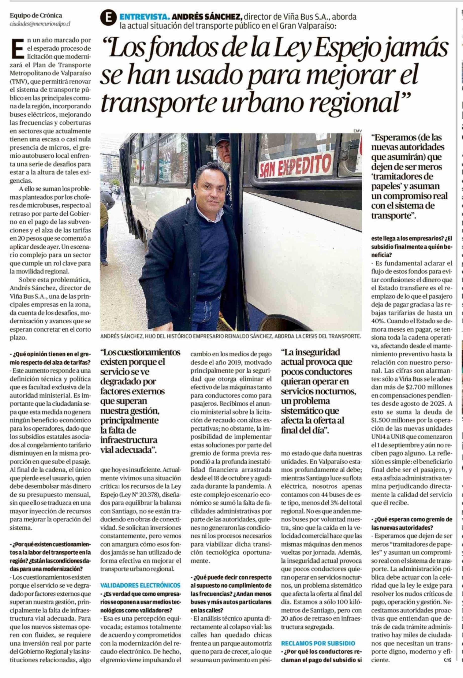 Título: "Los fondos de la Ley Espejo jamás se han usado para mejorar el transporte urbano regional"
