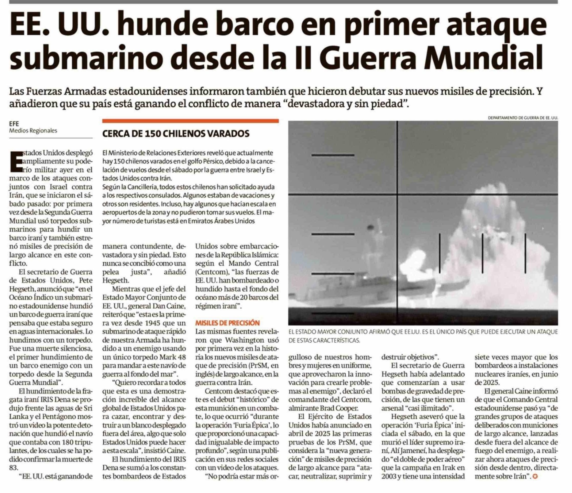 EE. UU. hunde barco en primer ataque submarino desde la II Guerra Mundial 05-03-2026 La Estrella de Chiloé |