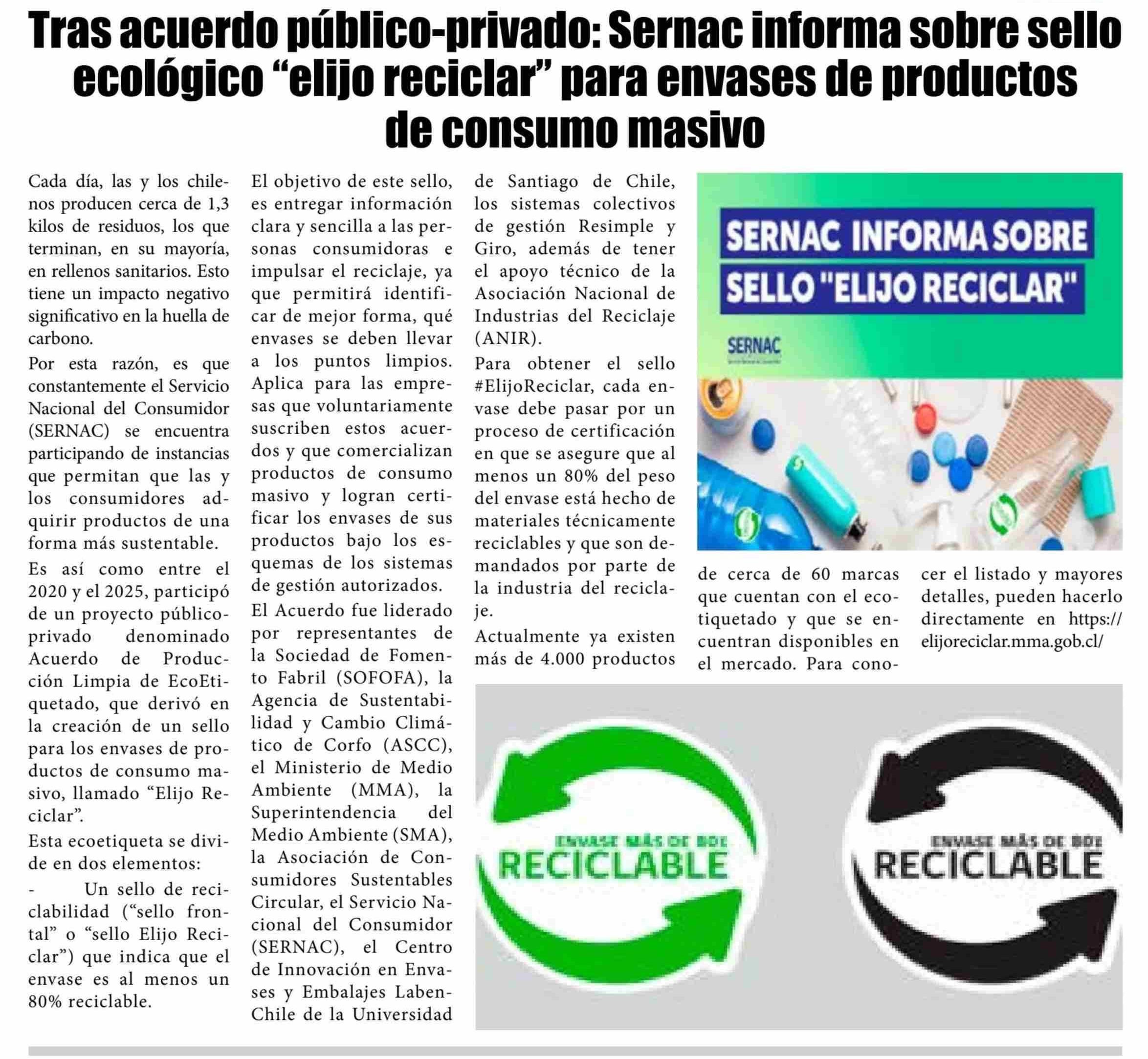 | Título: | Tras acuerdo público-privado: Sernac informa sobre sello ecológico “elijo reciclar” para envases de productos de consumo masivo |