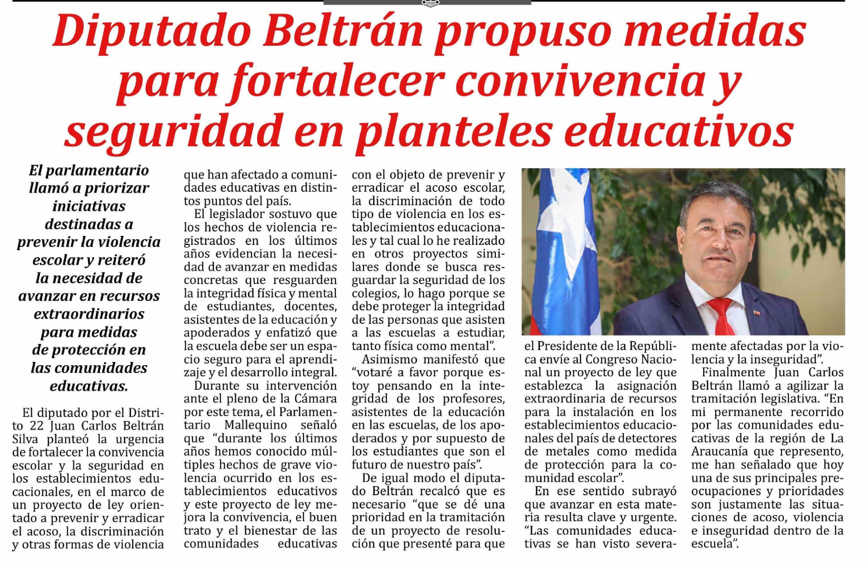 Título: Diputado Beltrán propuso medidas para fortalecer convivencia y