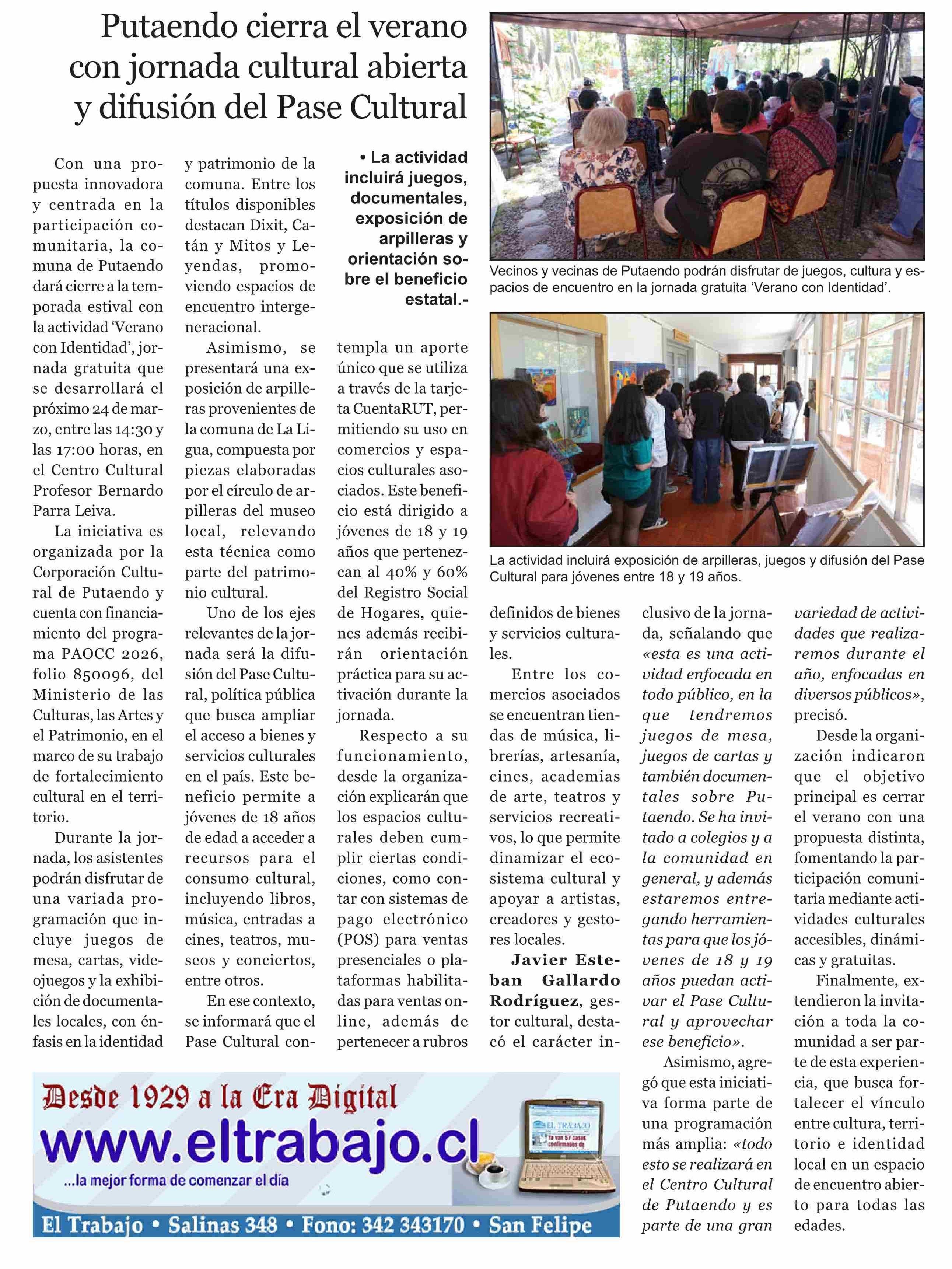 Título: Putaendo cierra el verano con jornada cultural abierta y difusión del Pase Cultural
