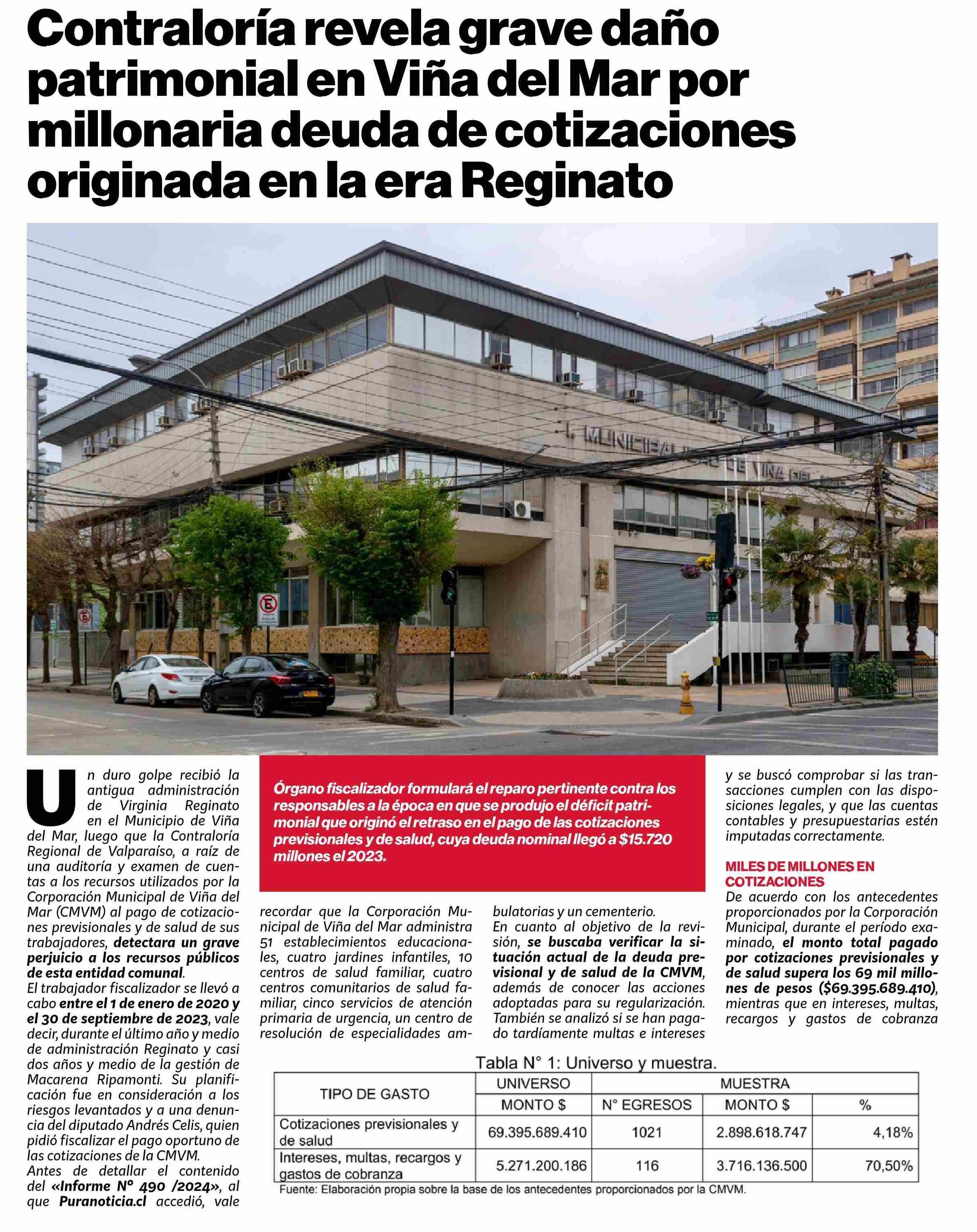Título: Contraloría revela grave daño patrimonial en Viña del Mar por millonaria deuda de cotizaciones originada en la era Reginato