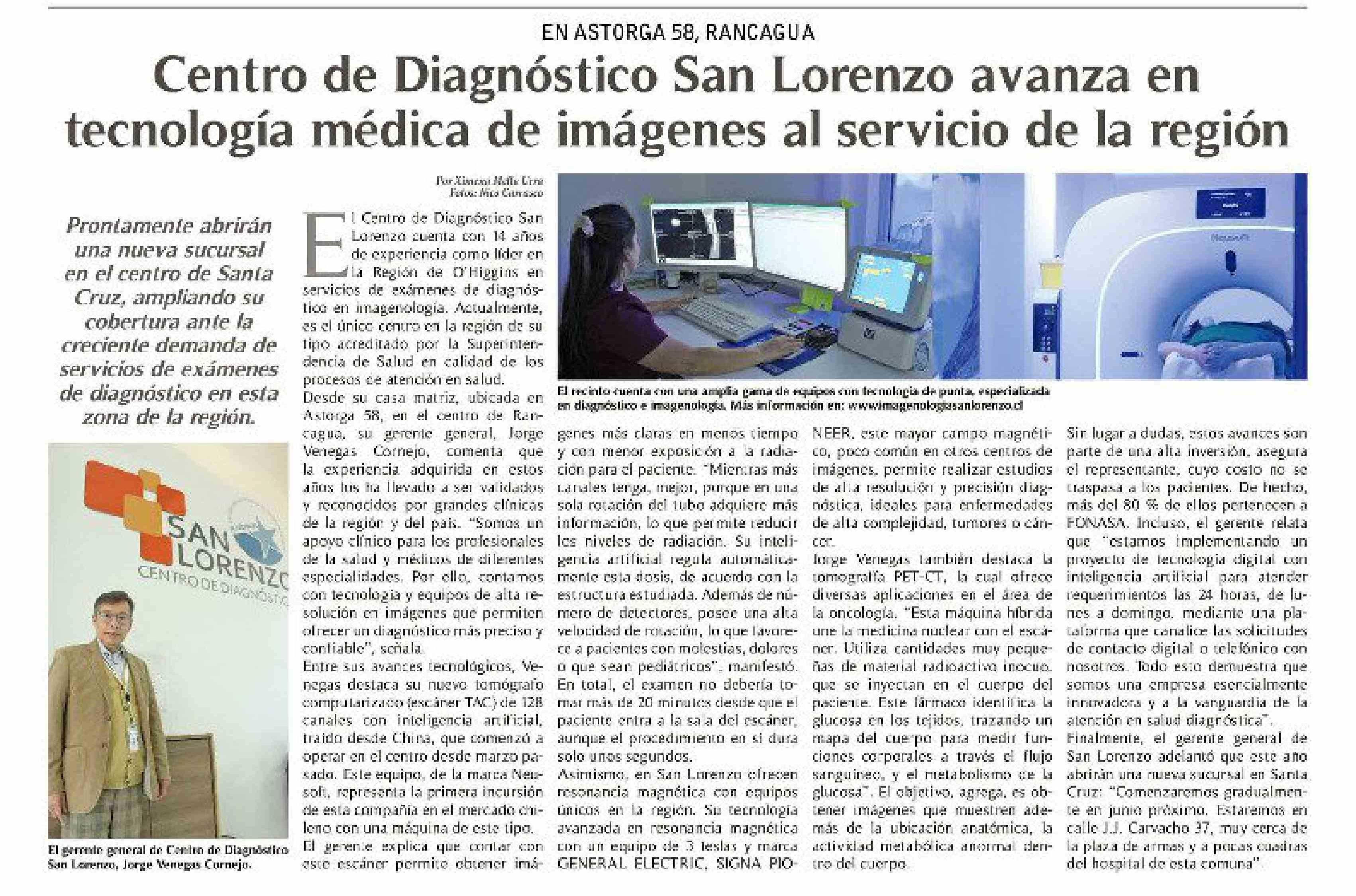 Centro de Diagnóstico San Lorenzo avanza en tecnología médica de imágenes al servicio de la región 02-06-2025 El Rancagüino |