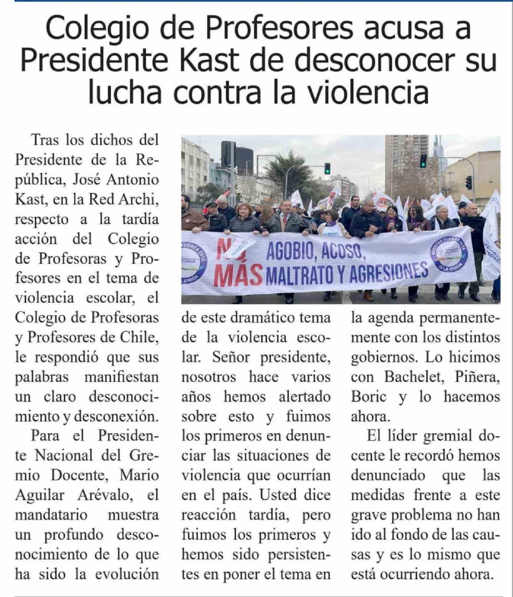 Título: Colegio de Profesores acusa a Presidente Kast de desconocer su lucha contra la violencia