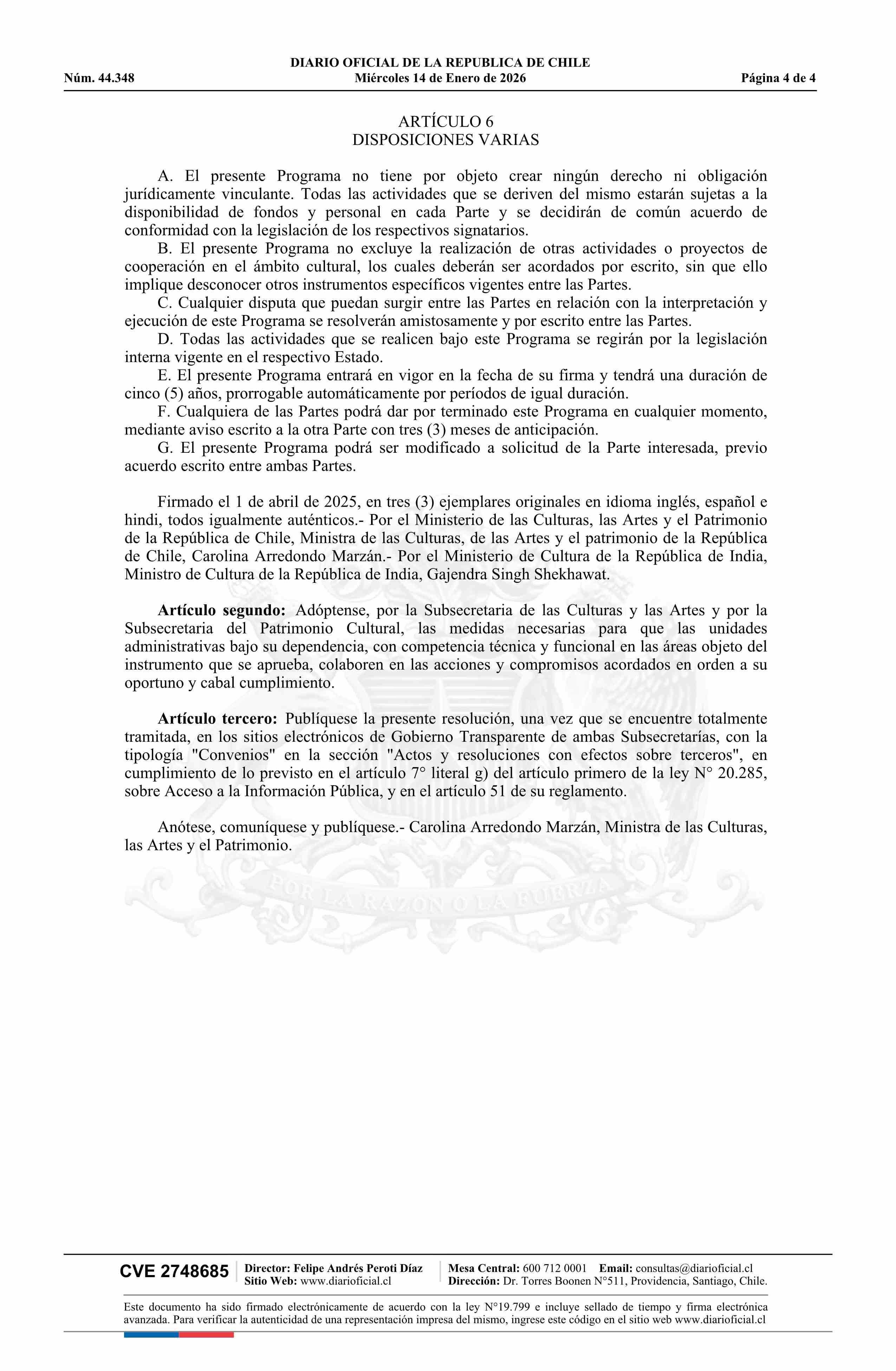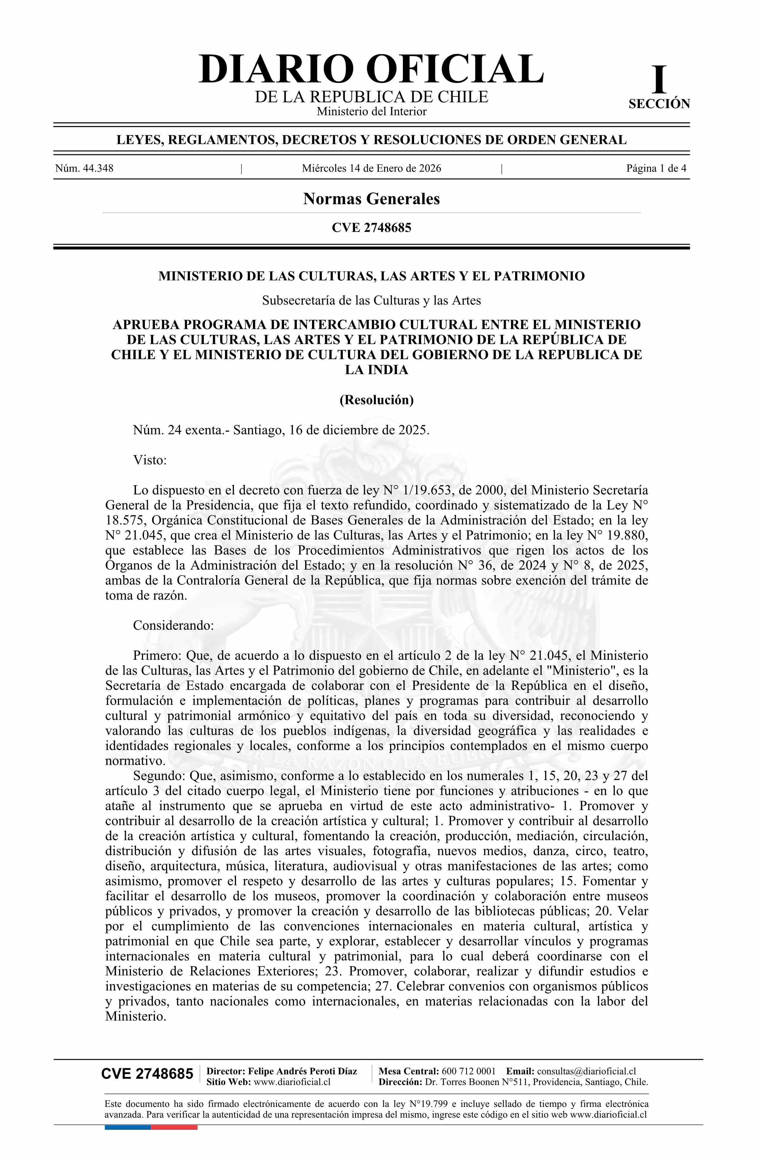 | Título: | Resolución exenta número 24, de 2025.- Aprueba Programa de Intercambio Cultural entre el Ministerio de las Culturas, las Artes y el Patrimonio de la República de Chile y el Ministerio de Cultura del Gobierno de la Republica de la India |