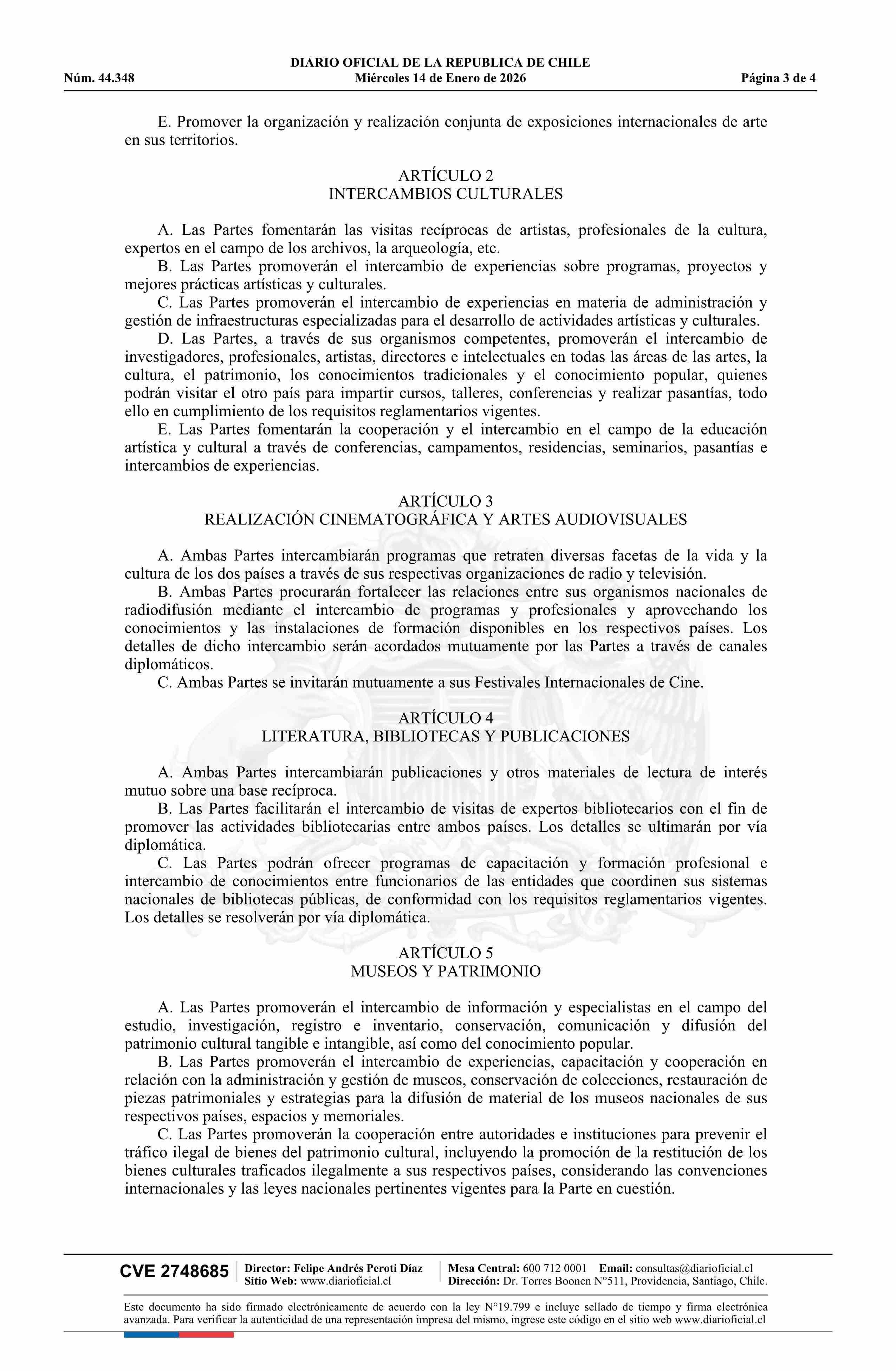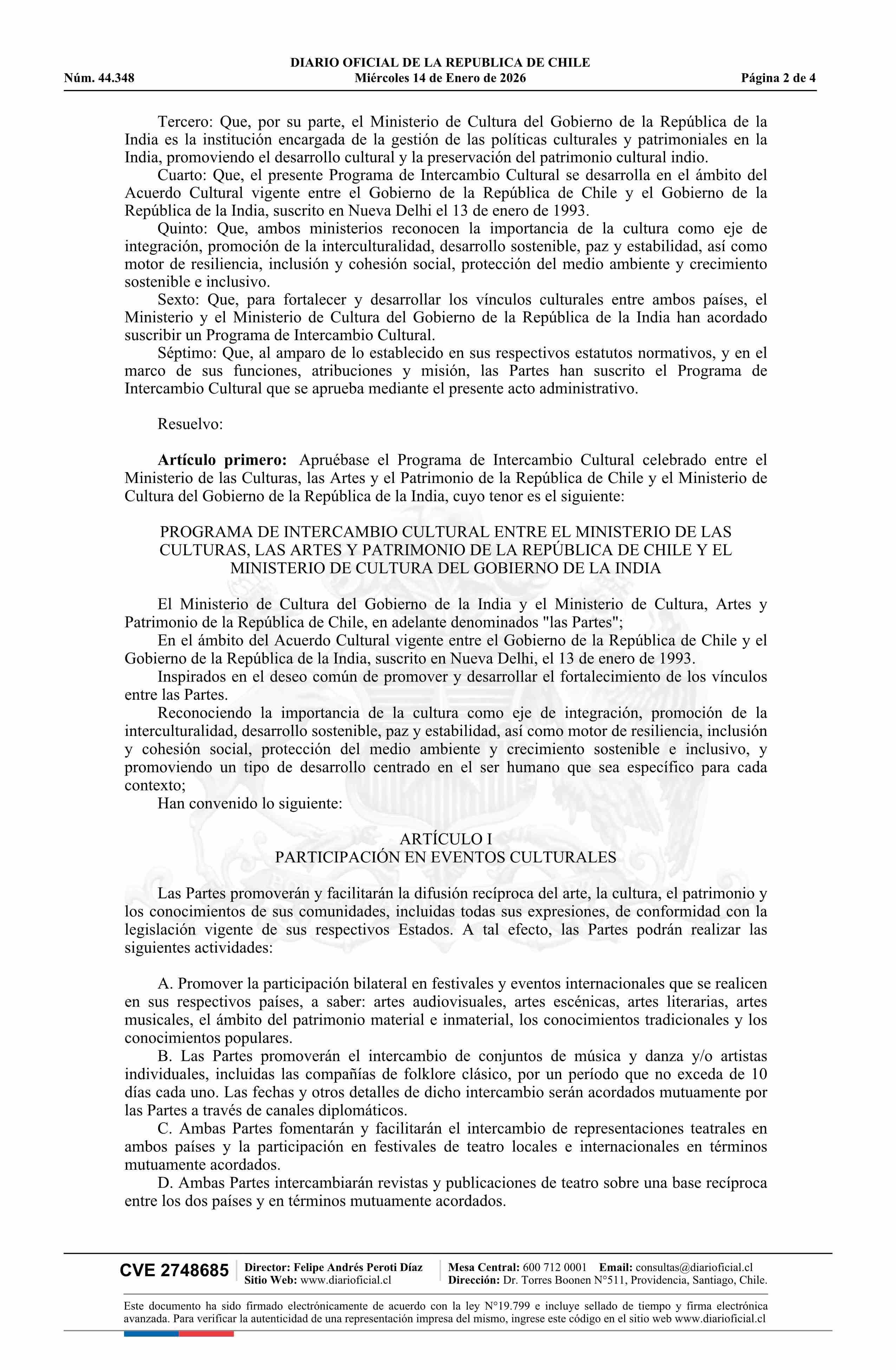 Resolución exenta número 24, de 2025.- Aprueba Programa de Intercambio Cultural entre el Ministerio de las Culturas, las Artes y el Patrimonio de la República de Chile y el Ministerio de Cultura del Gobierno de la Republica de la India 14-01-2026 DIARIO OFICIAL CHILE - BOLETÍN OFICIAL DE MINERÍA |