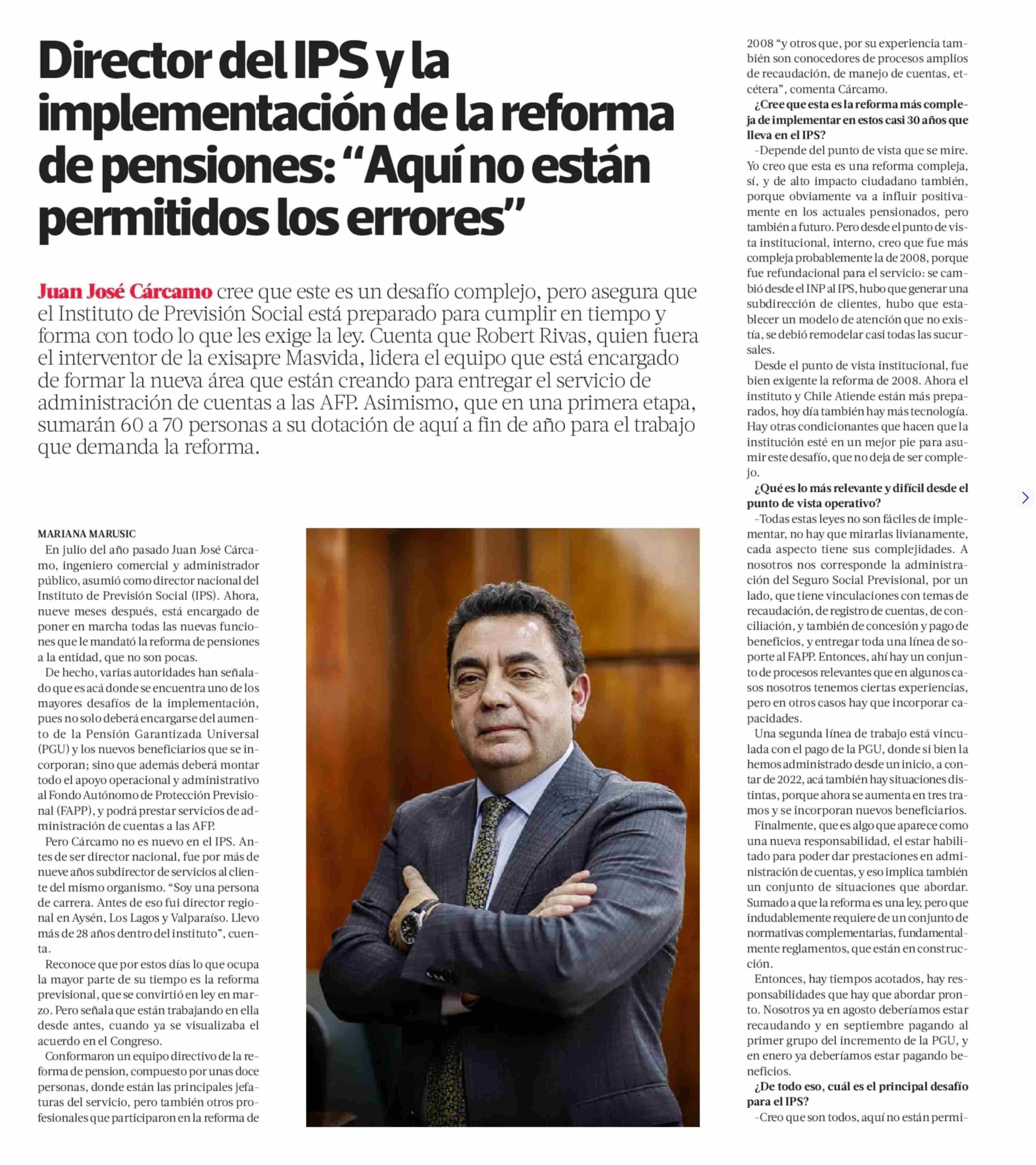 Director del IPS y la implementación de la reforma de pensiones: “Aquí no están permitidos los errores” 18-04-2025 La Tercera |