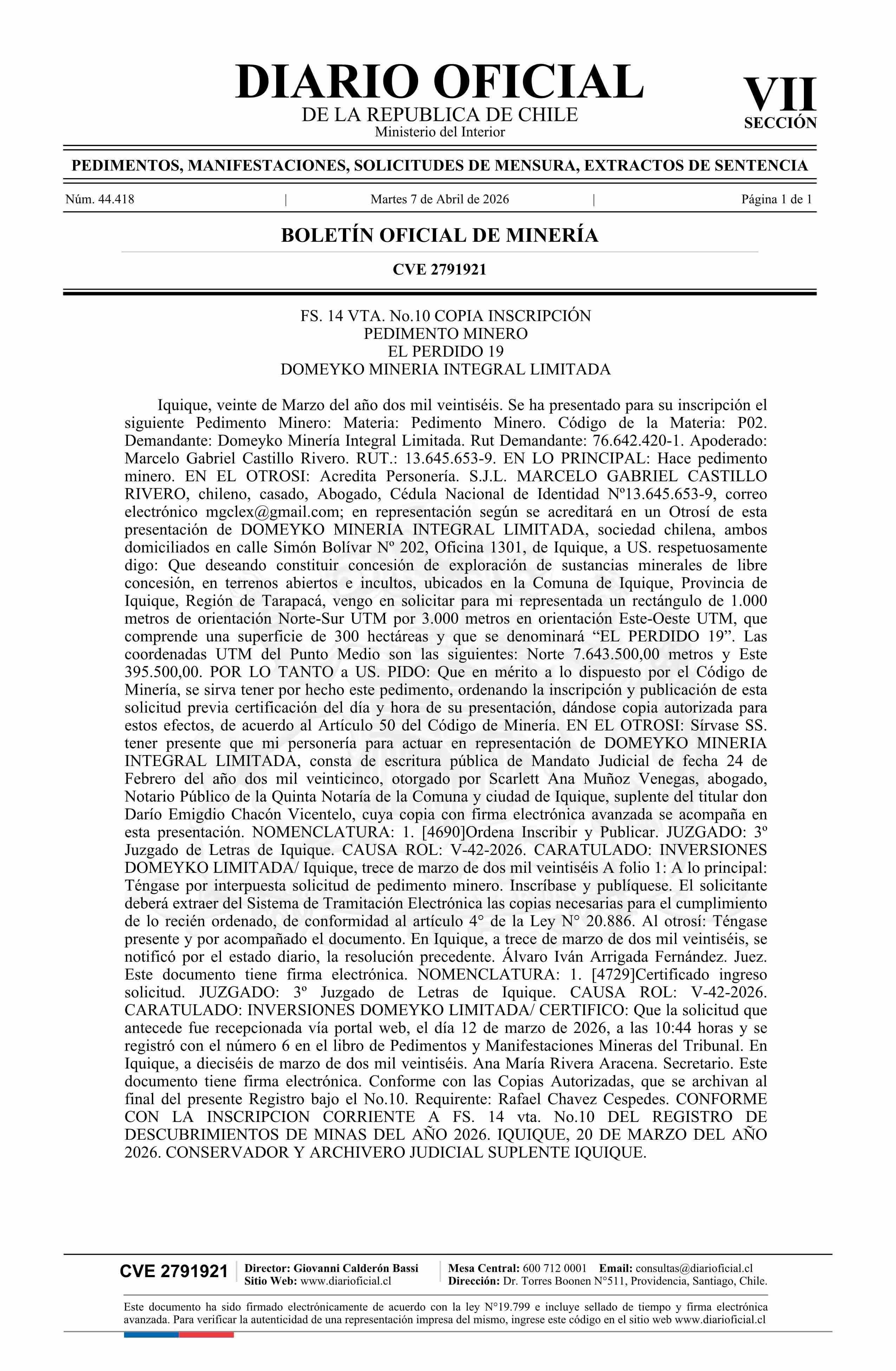 Título: EL PERDIDO 19 / Domeyko Minería Integral Limitada