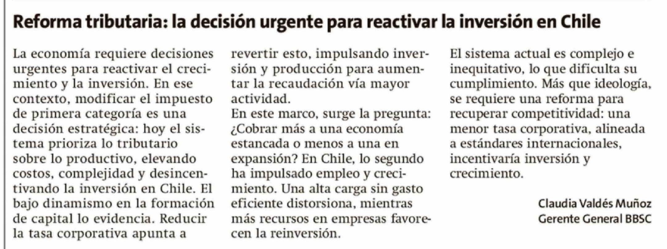 Título: Columnas de Opinión: Reforma tributaria: la decisión urgente para reactivar la inversión en Chile