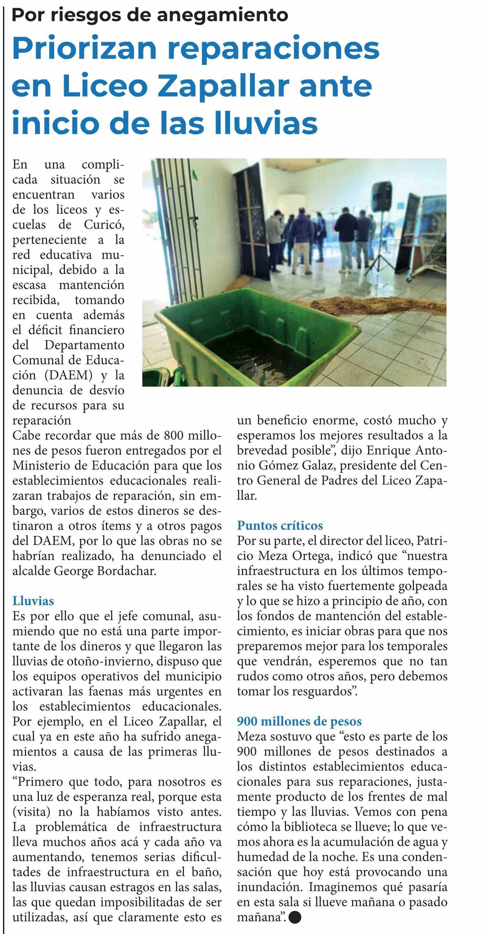 Priorizan reparaciones en Liceo Zapallar ante inicio de las lluvias 01-06-2025 Diario Talca |